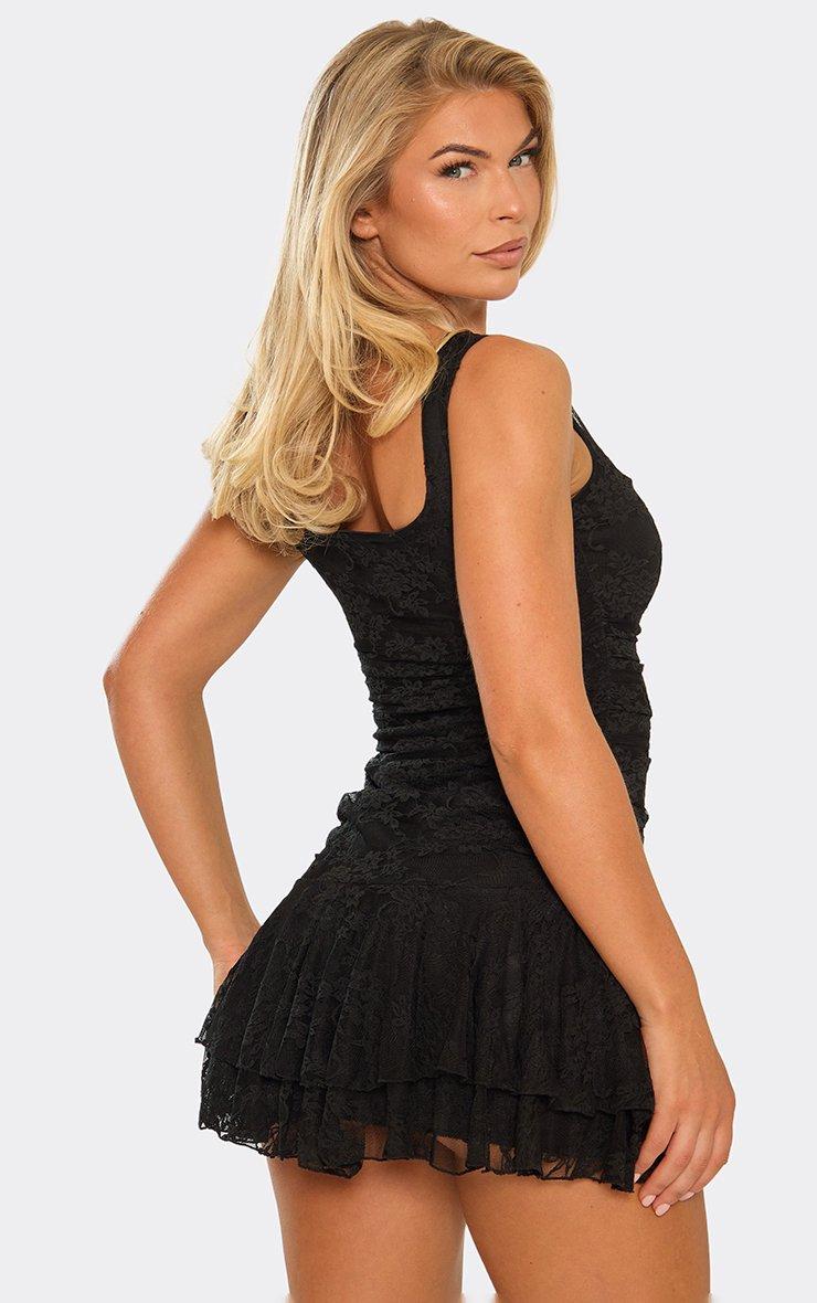 Square Neck Frill Hem Detail Mini Dress In Black Lace