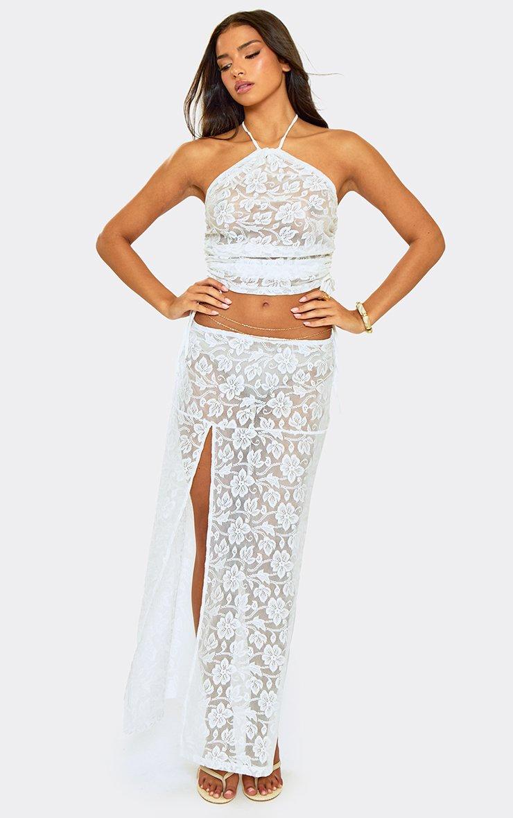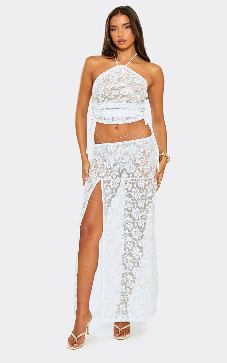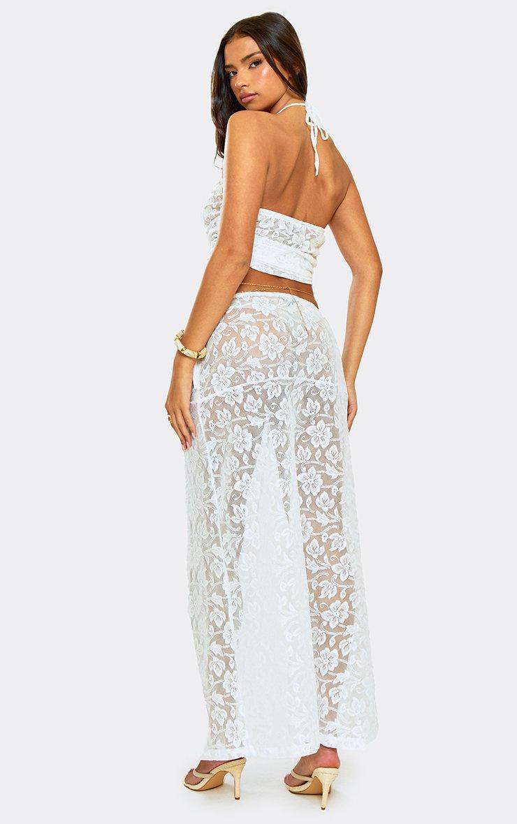 Mid Rise Split Leg Detail Maxi Skirt In White Lace