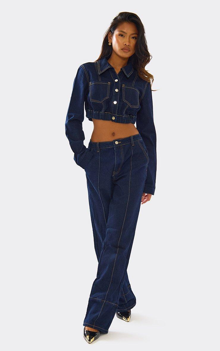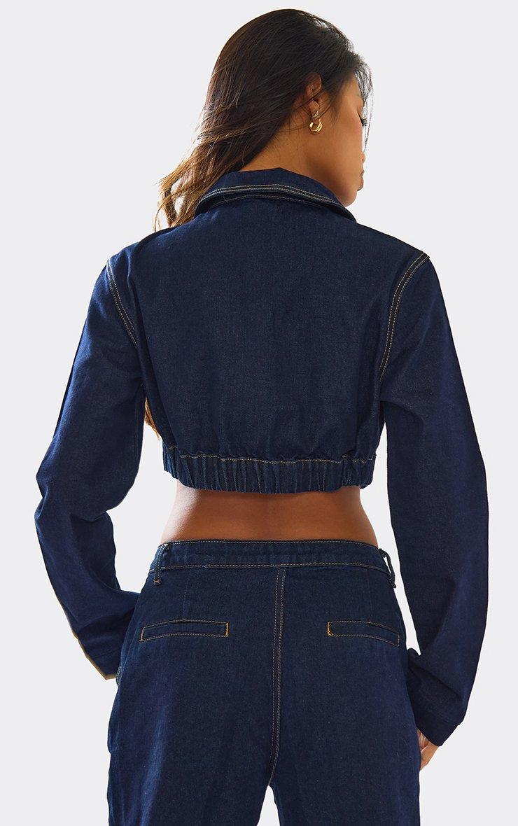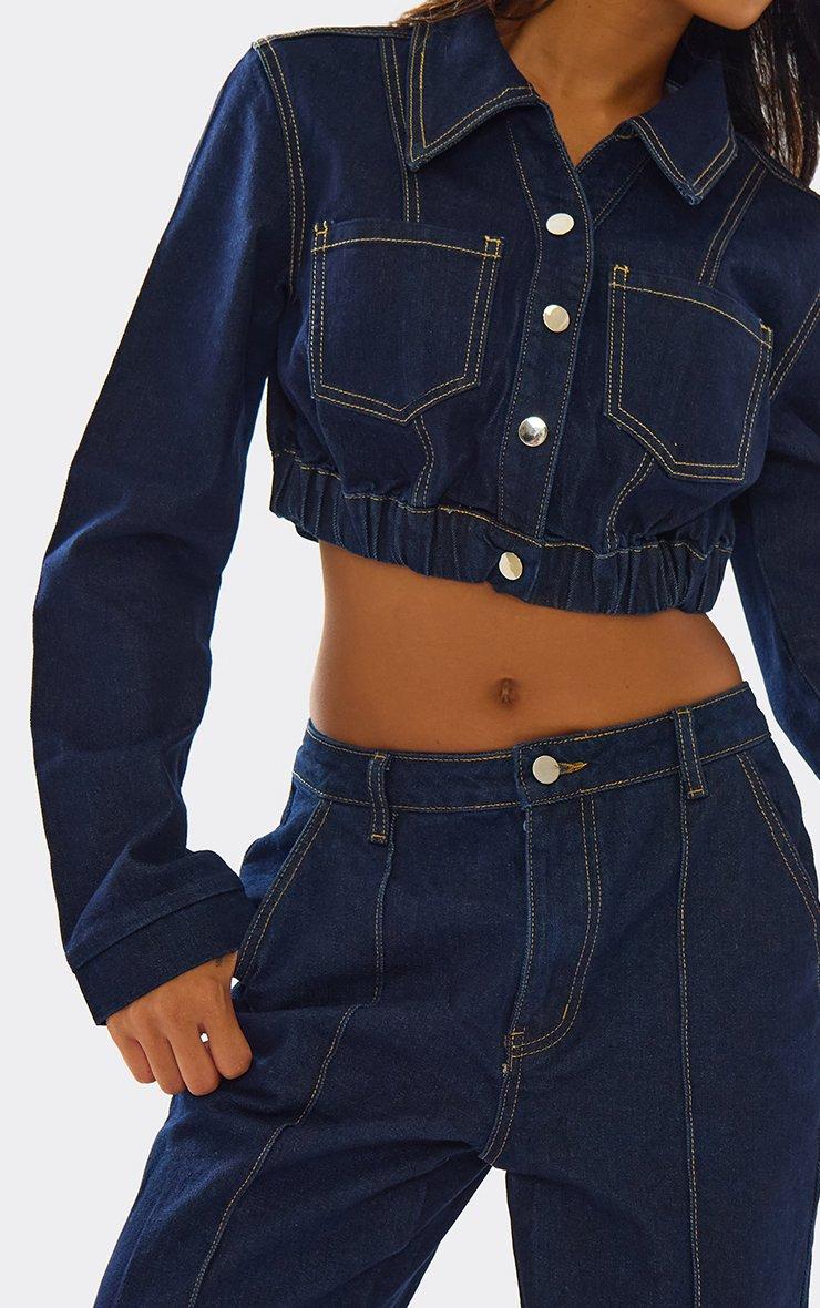 Long Sleeve Button Down Cinched Waist Detail Crop Jacket In Indigo Blue Denim