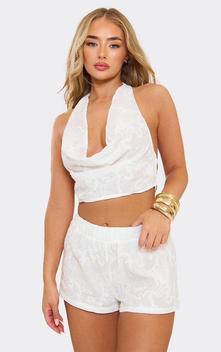 Halterneck Top In White Floral Textured Linen