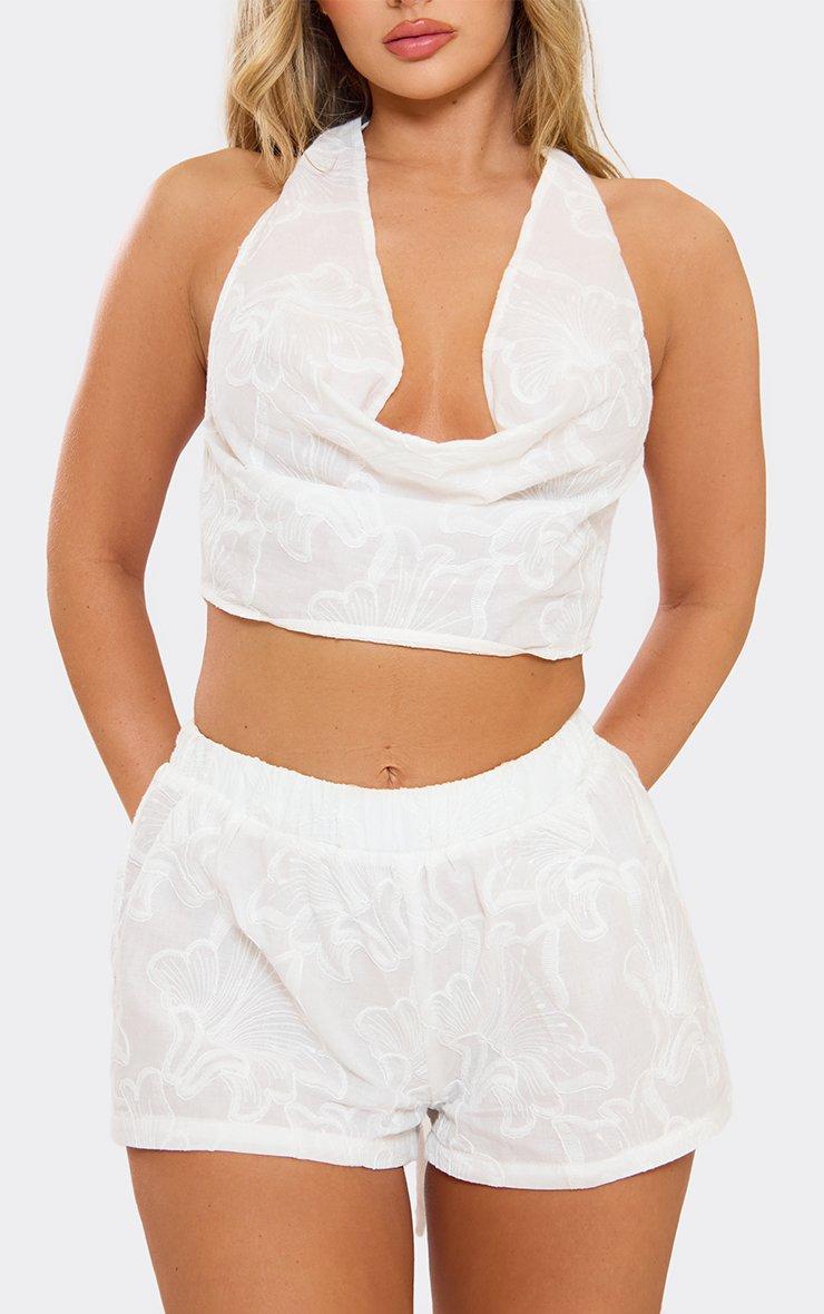 halterneck top in white floral textured linen