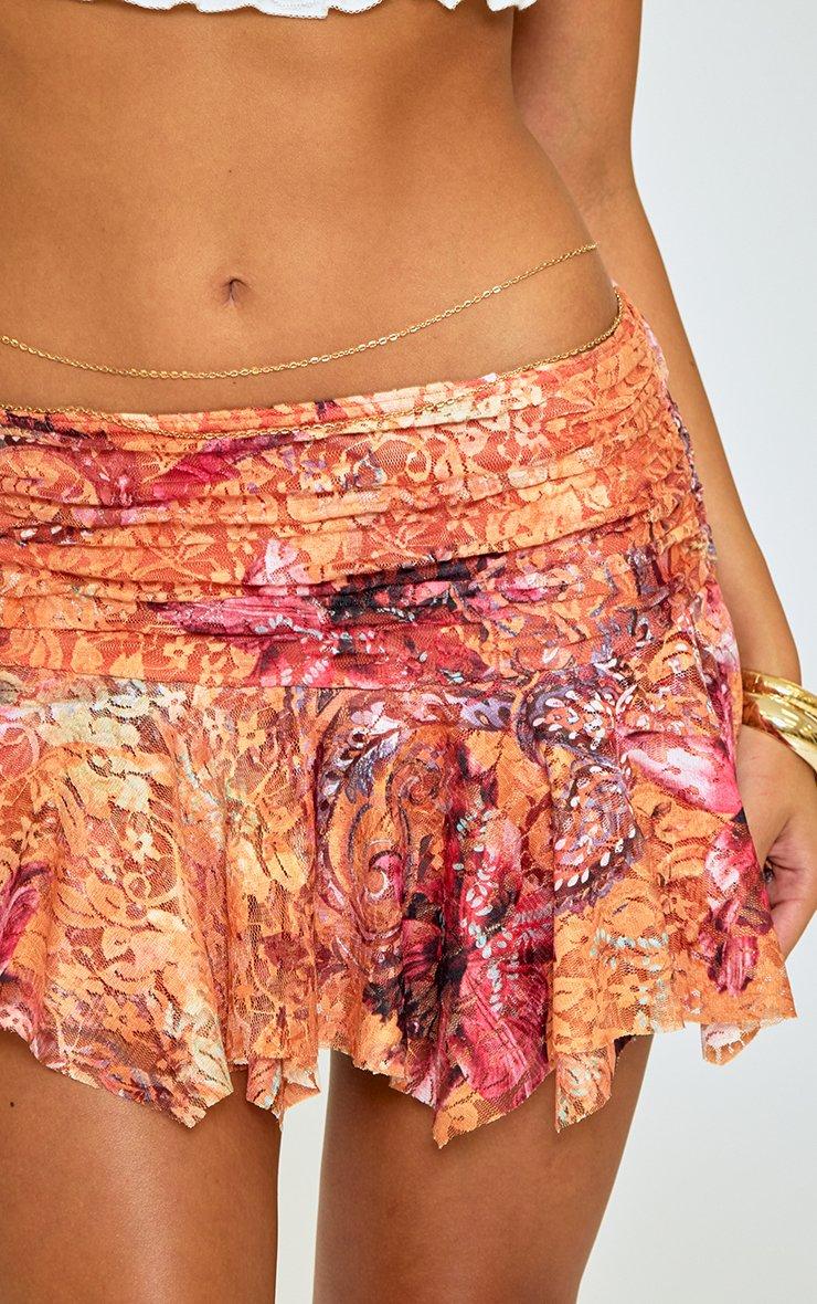 Low Rise Ruffle Hem Detail Mini Skirt In Orange Printed
