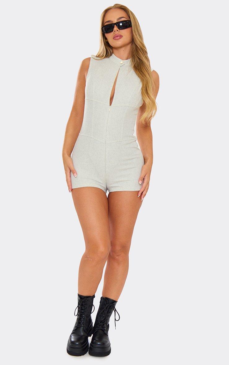 Hight Neck Zip Front Keyhole Detail Playsuit In Grey