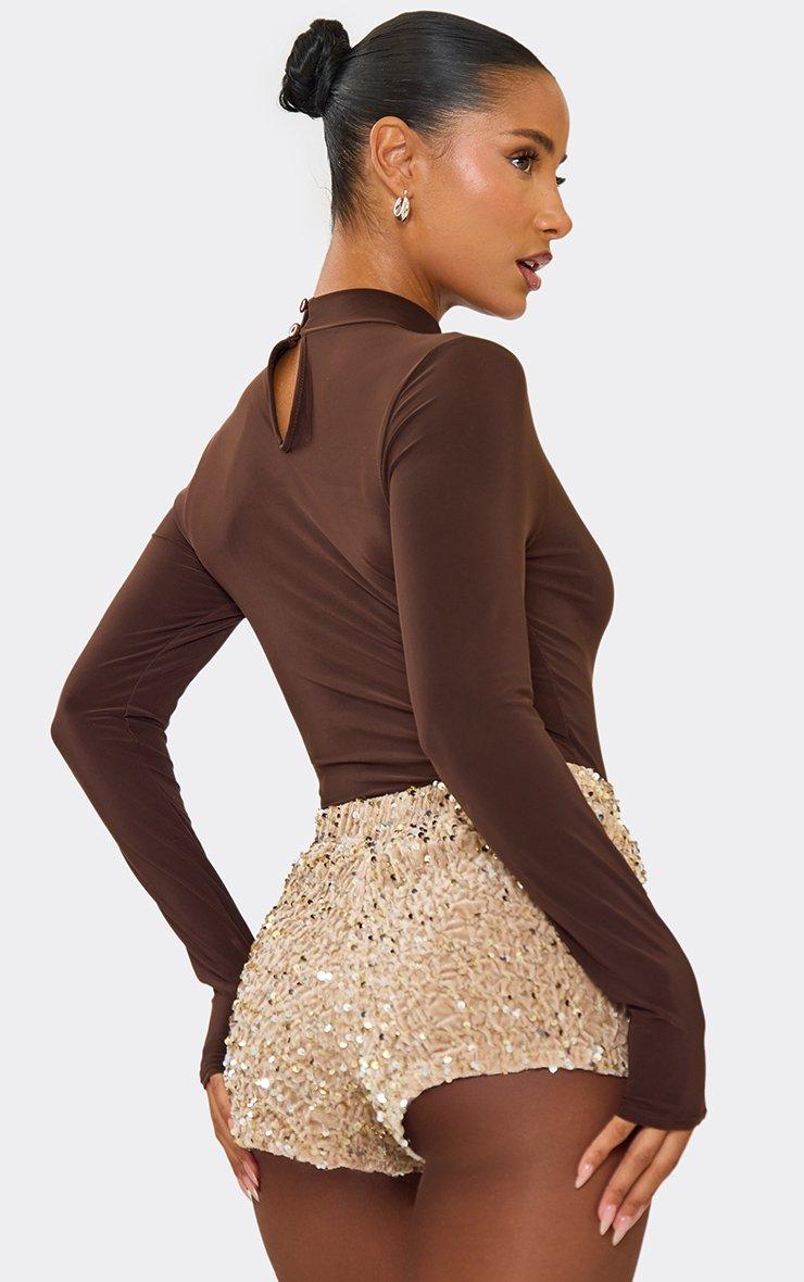 Mid Rise Drawstring Waist Detail Mini Shorts In Brown Wet Look