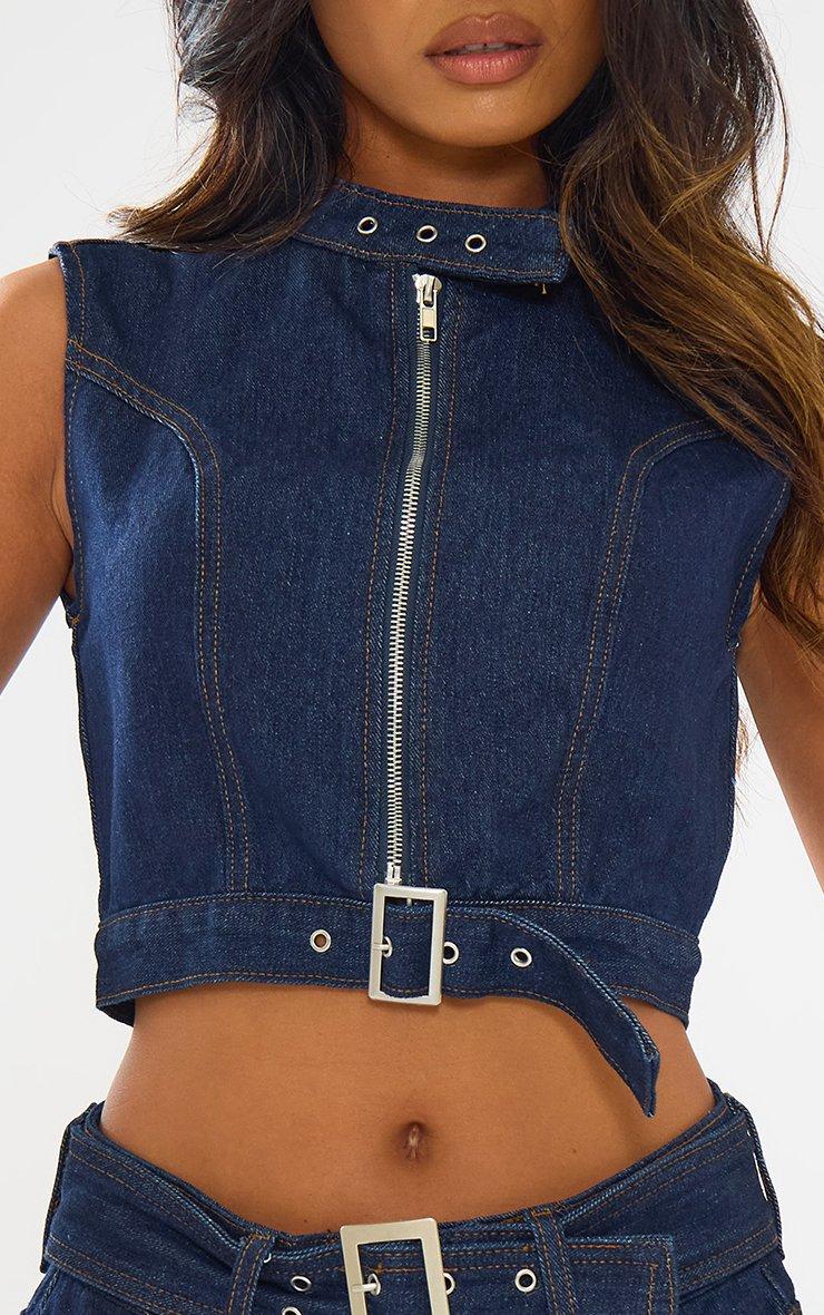 Sleeveless Lace Up Front Crop Top In Vintage Blue Denim