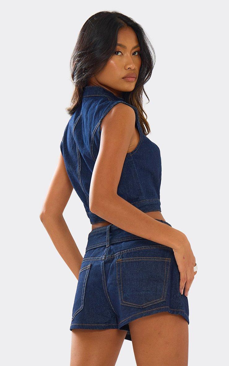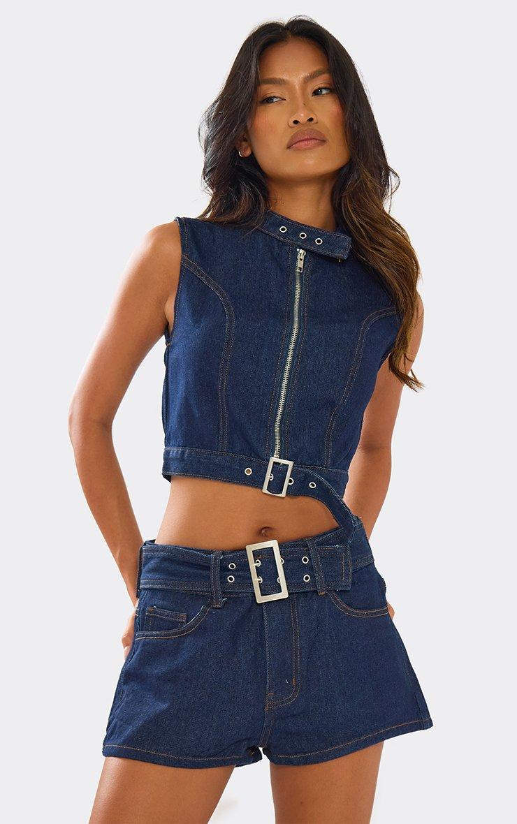 One Shoulder Button Detail Top In Indigo Blue Denim
