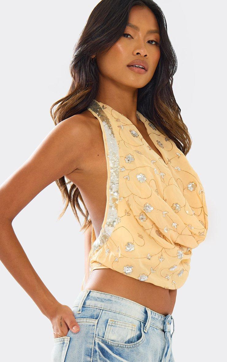 Cowl Neck Sequin Trim Detail Top In Nude Floral Sequin