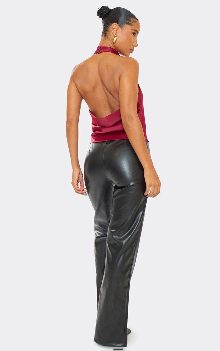 Low Rise Fold Over Waistband Straight Leg Trousers In Black Faux Leather