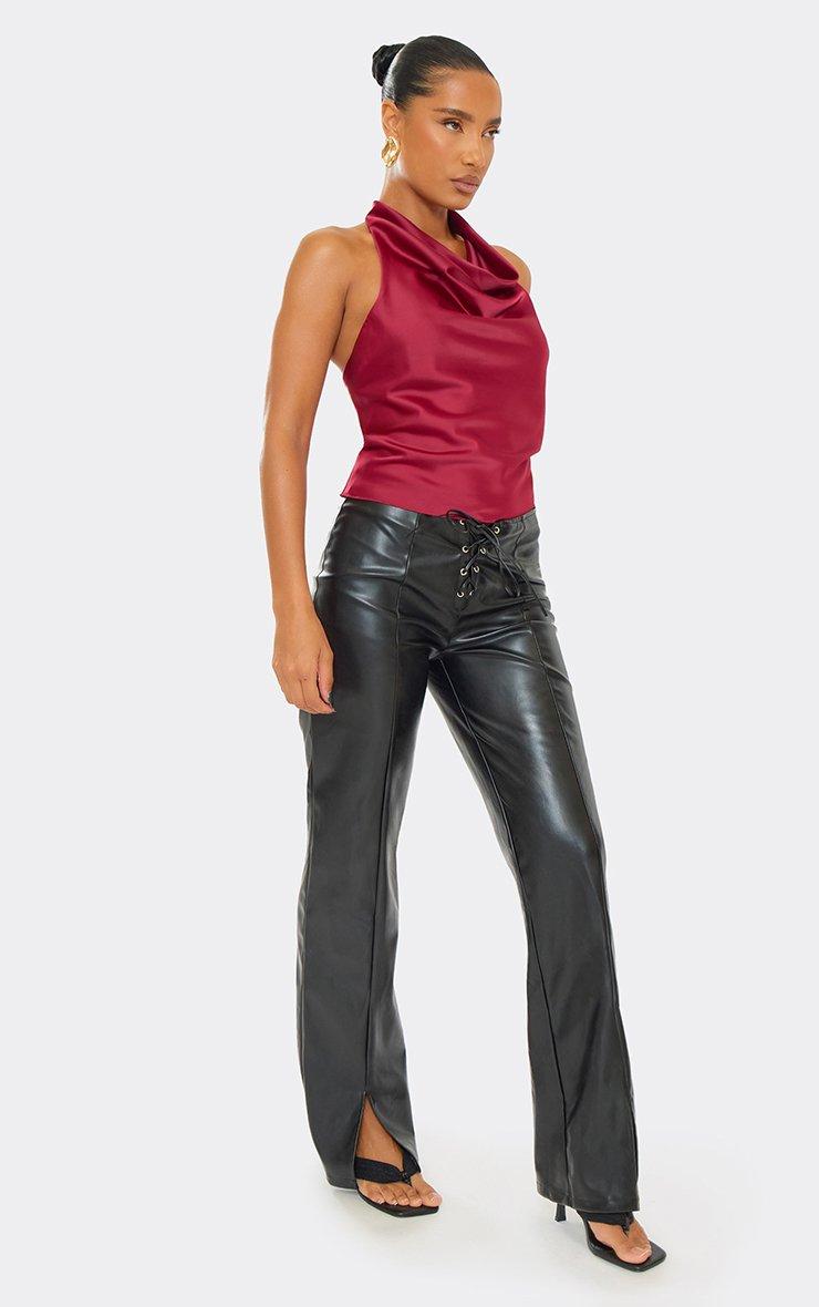 Lace Up Front Split Hem Detail Trousers In Black Faux Leather