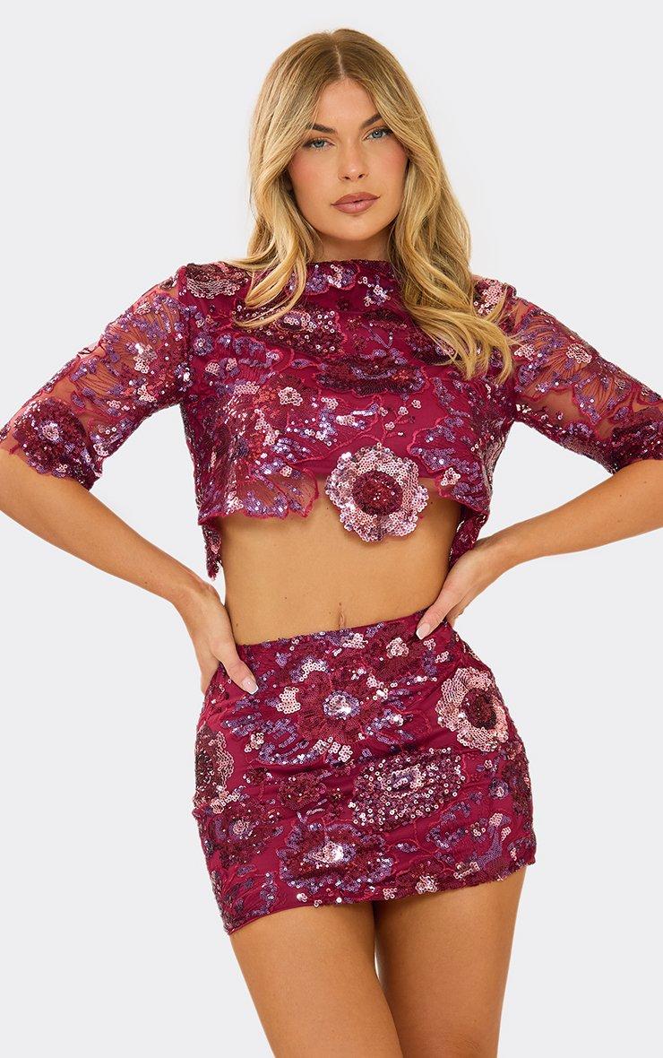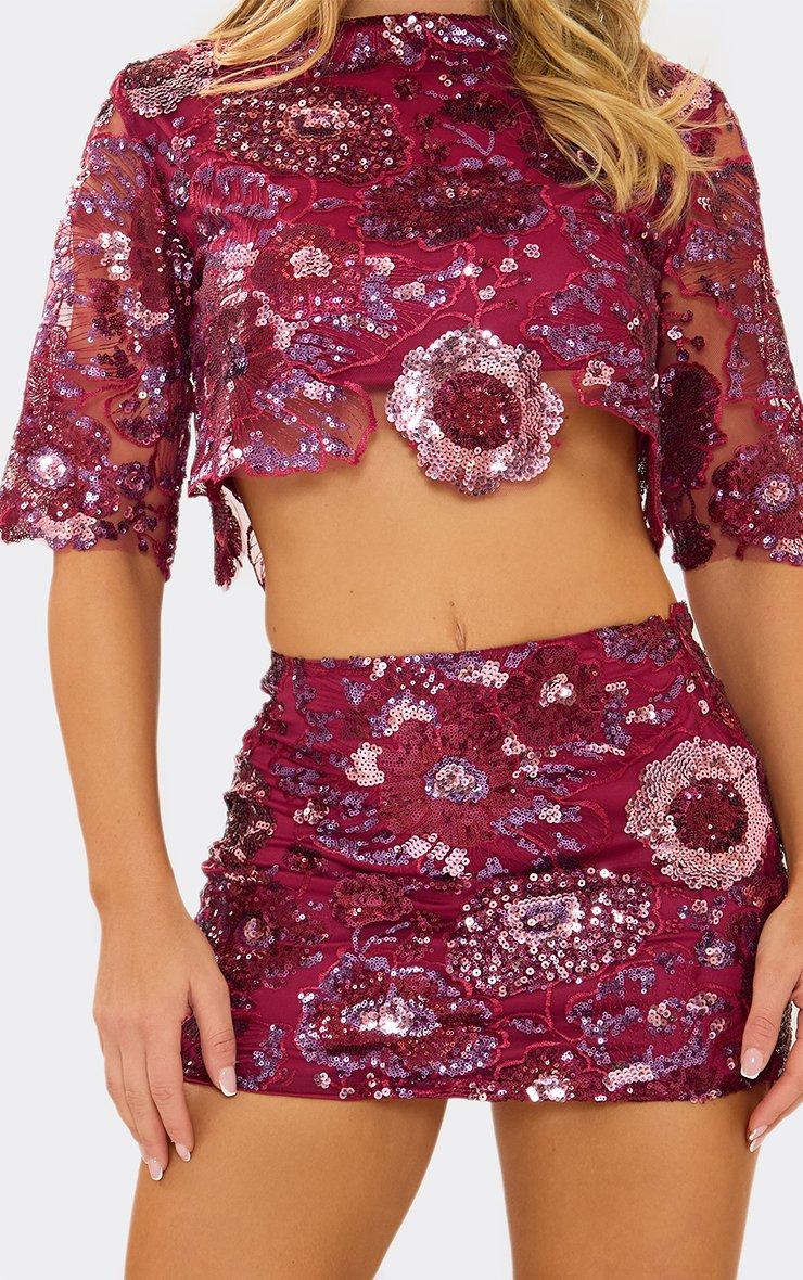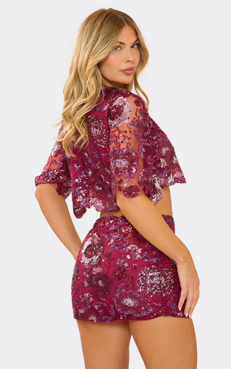 Short Sleeve Floral Embellished Crop Top In Burgundy Multi Sequin