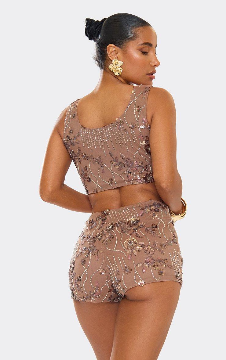Mid Rise Bead Embellished Hot Pant Shorts In Brown