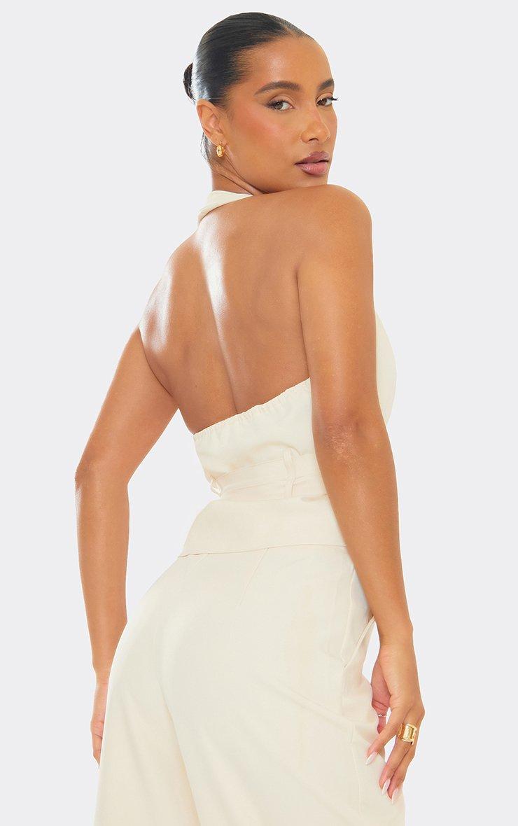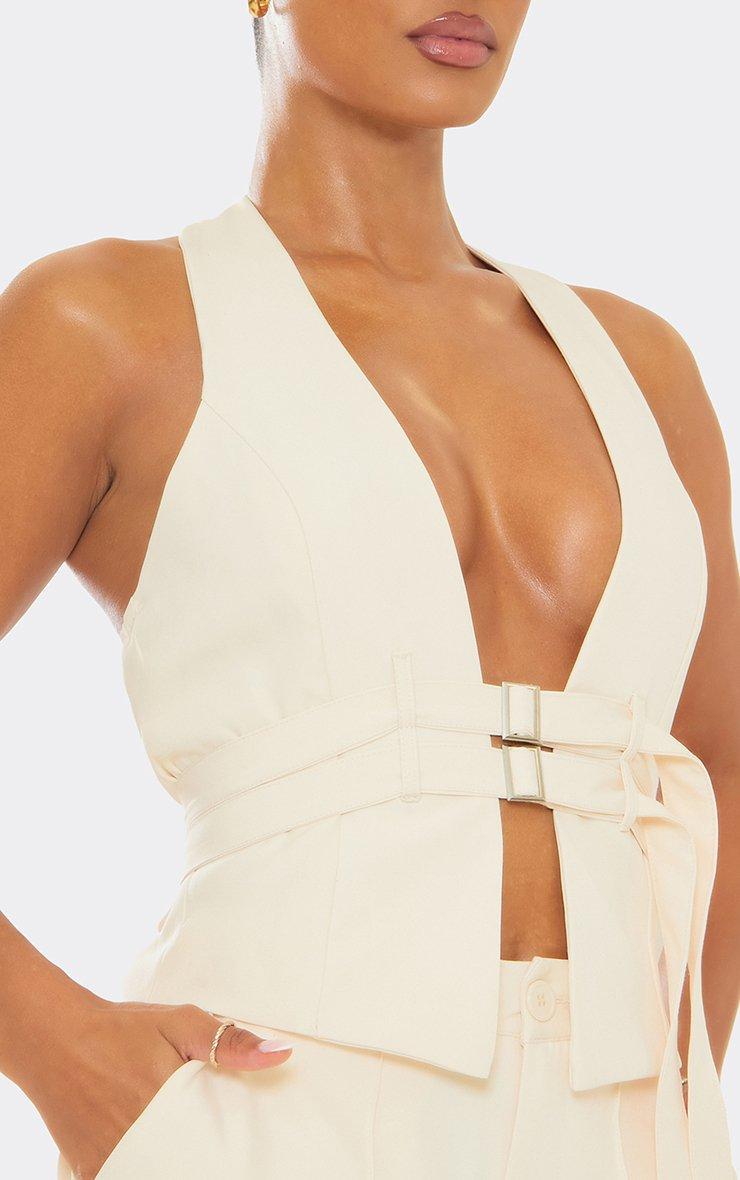 Plunge Button Front Tie Back Waistcoat In Stone Linen