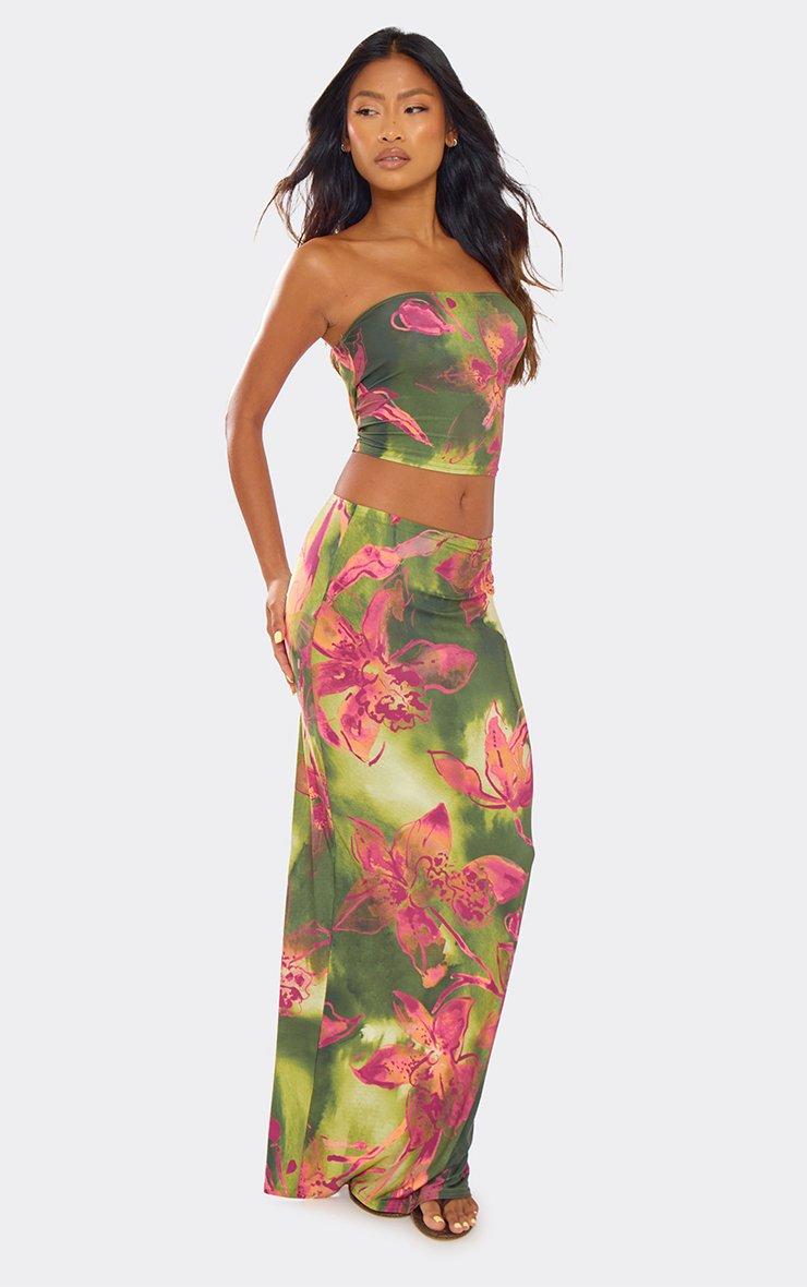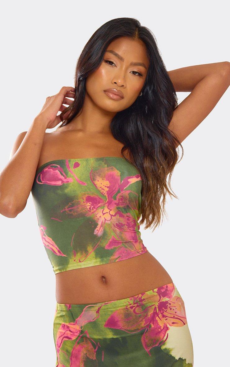 Contrast Fold Over Bandeau Crop Top In Green Abstract Print Slinky