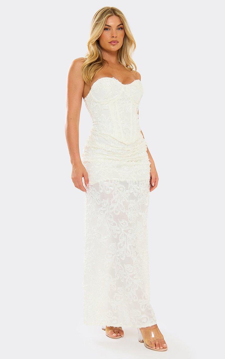 Mid Rise Fold Over Detail Maxi Skirt In Cream Textured Lace
