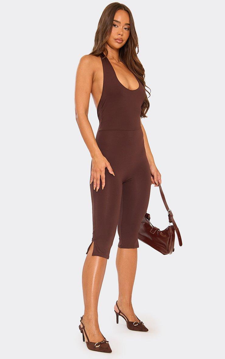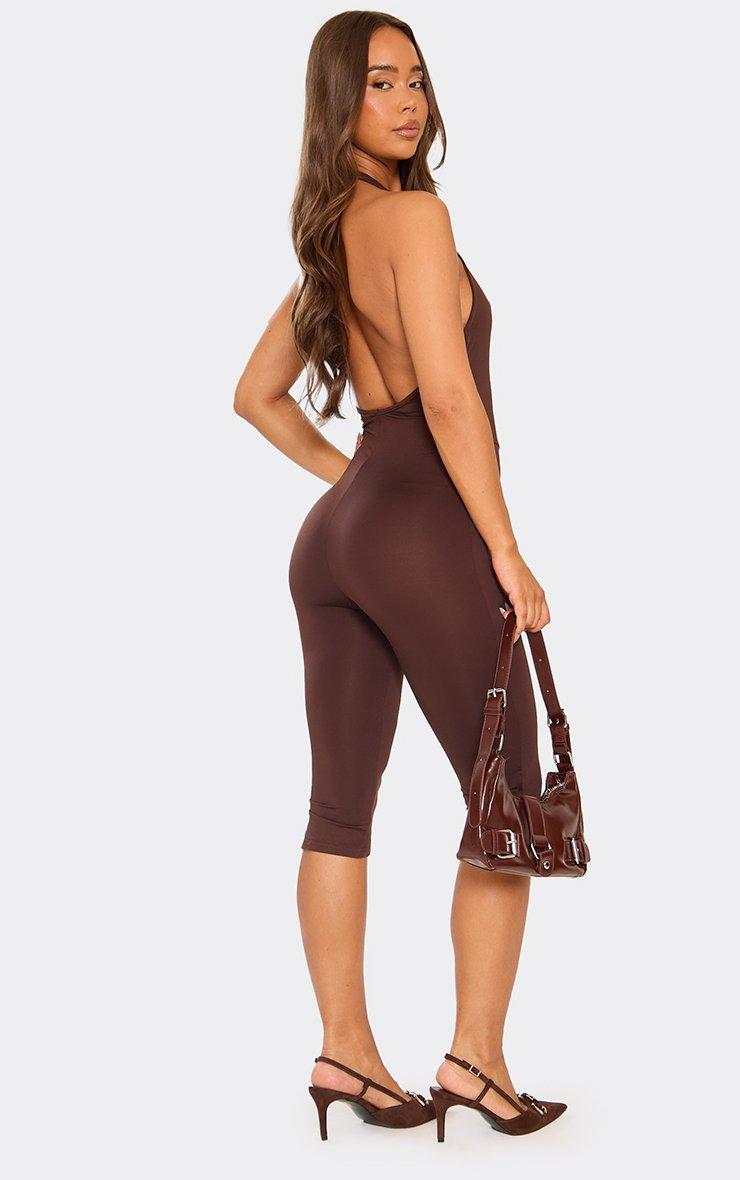 Plunge Halterneck Cowl Capri Jumpsuit In Chocolate Brown