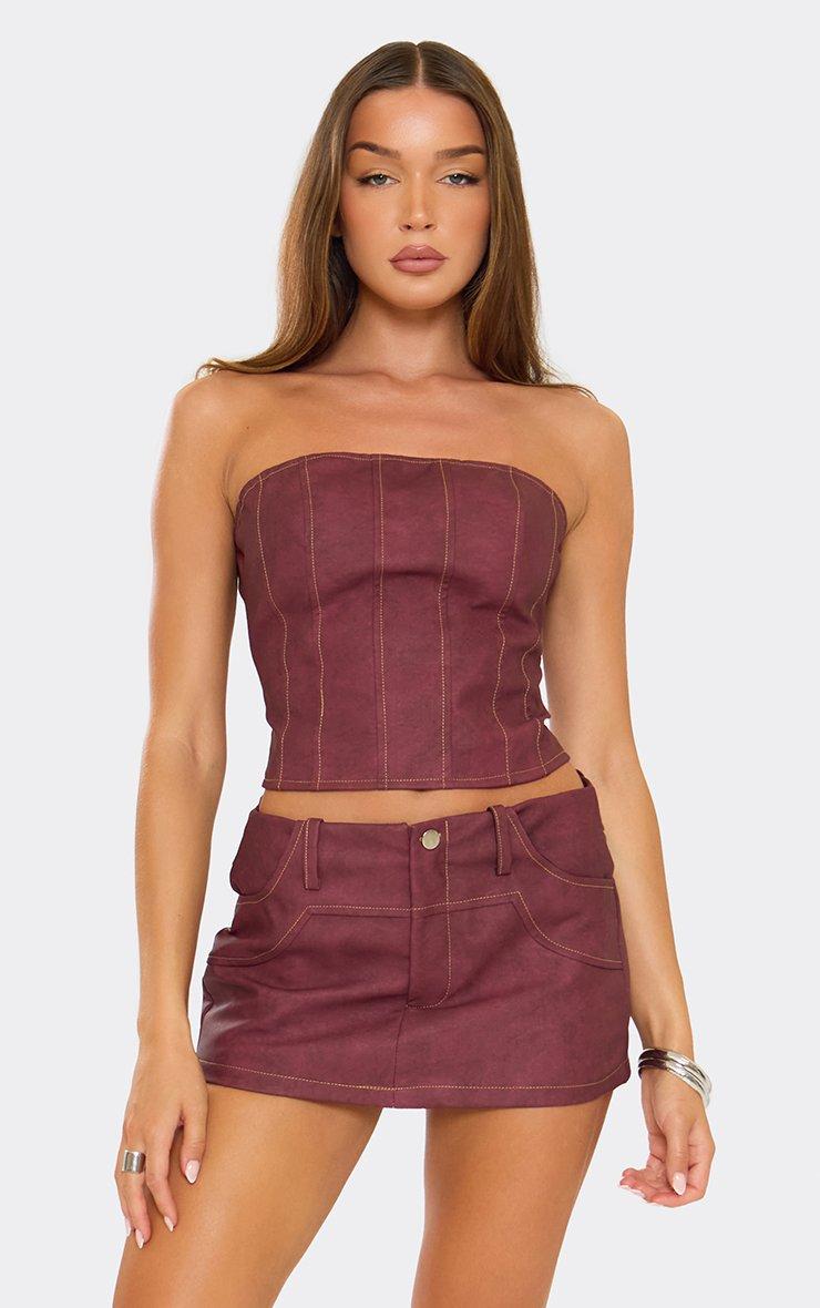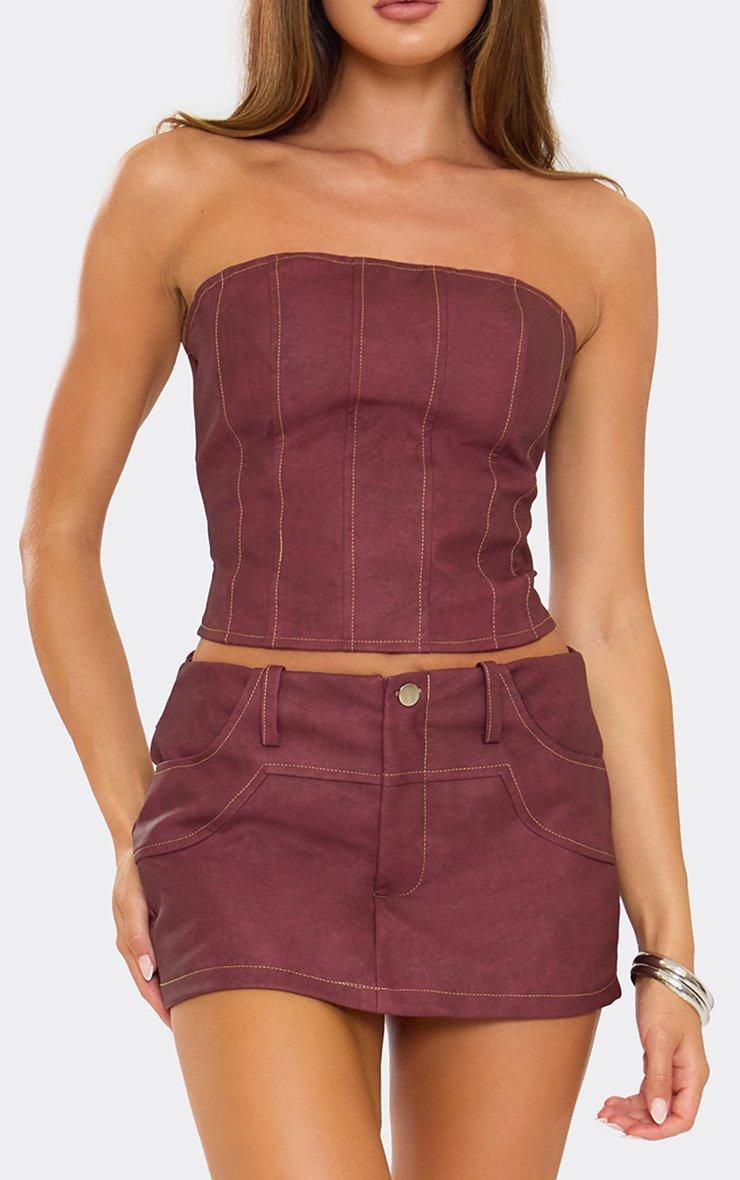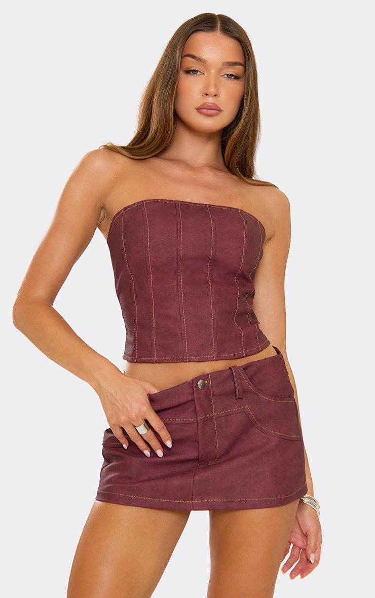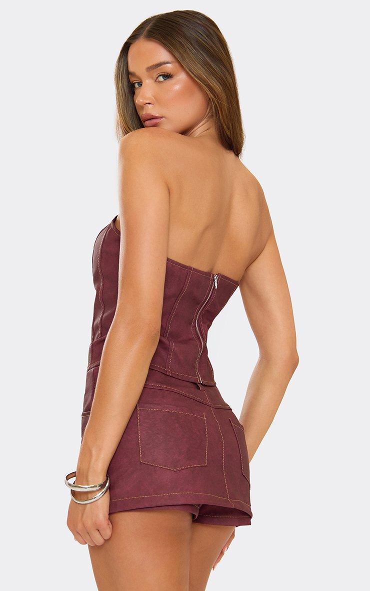 bandeau contrast stitch panel corset top in burgundy faux leather