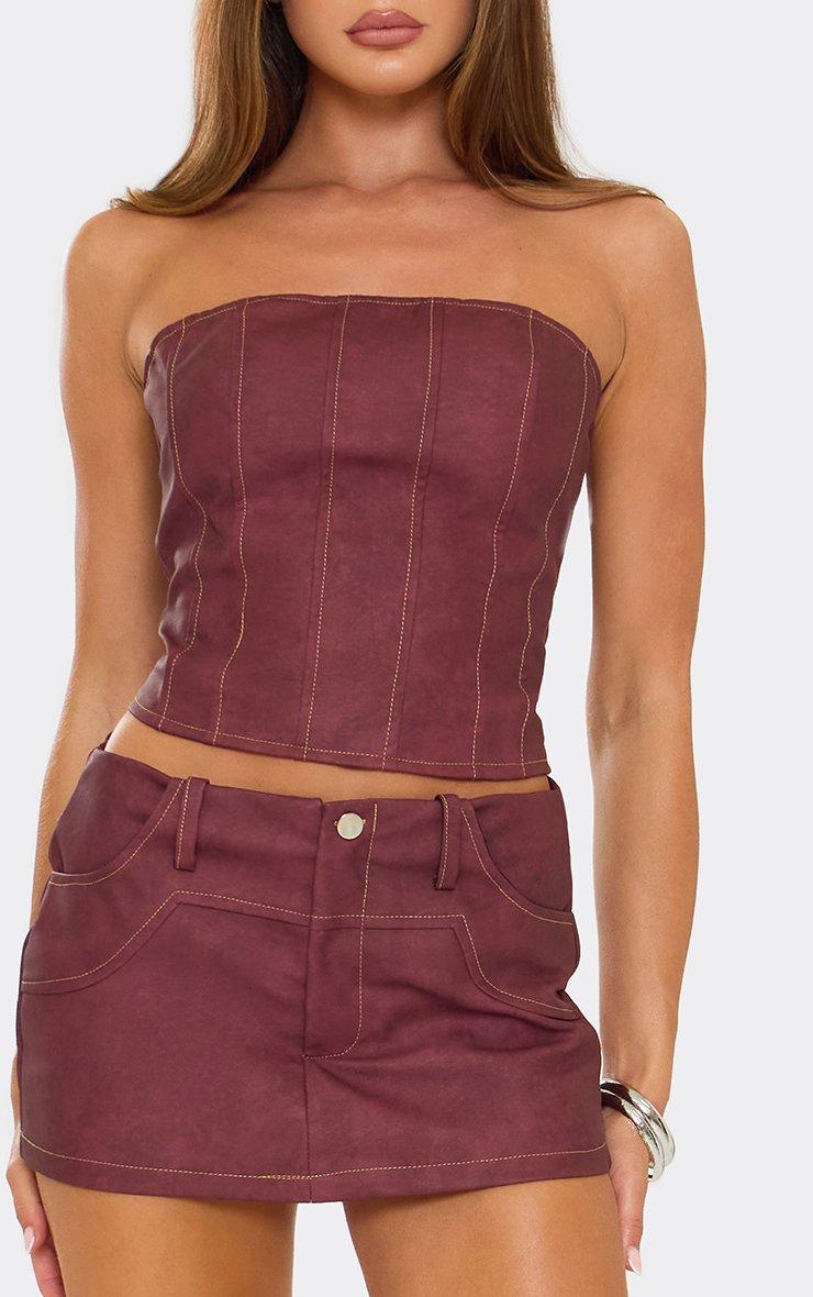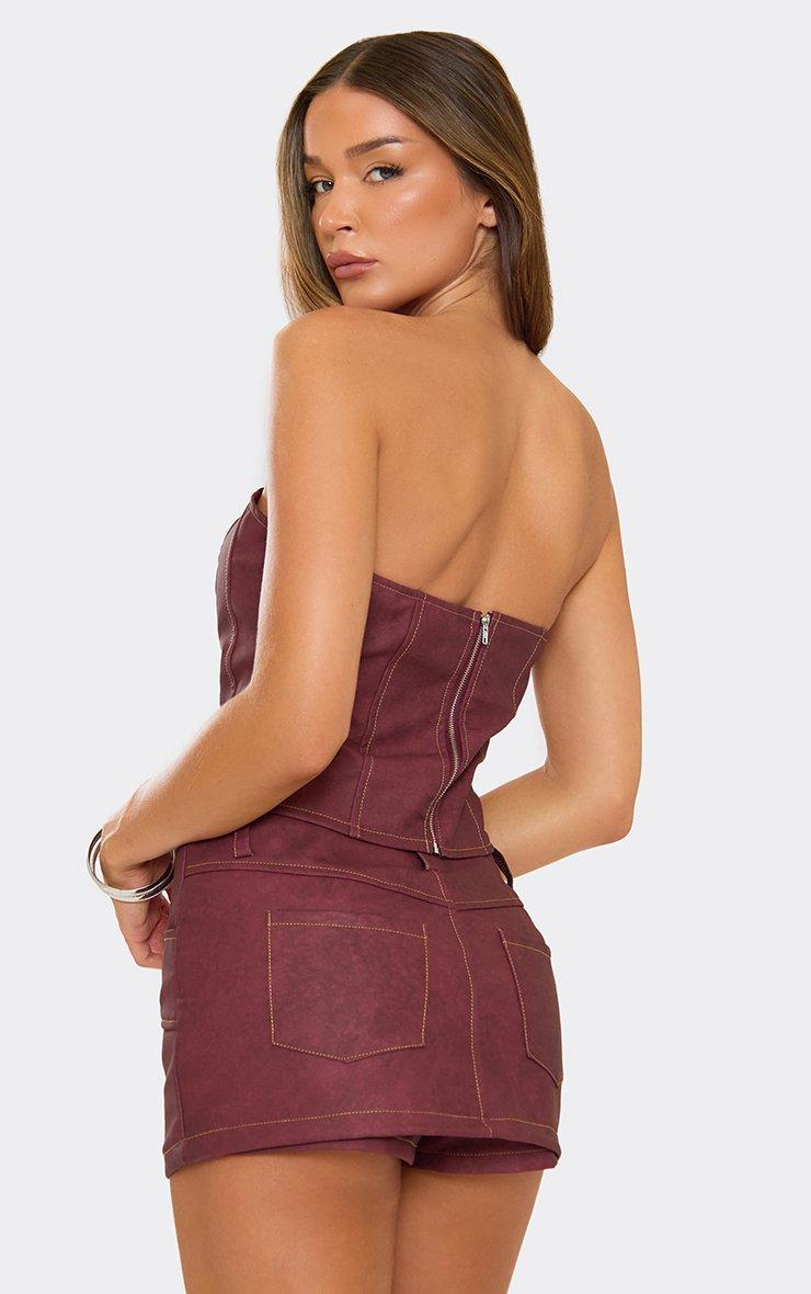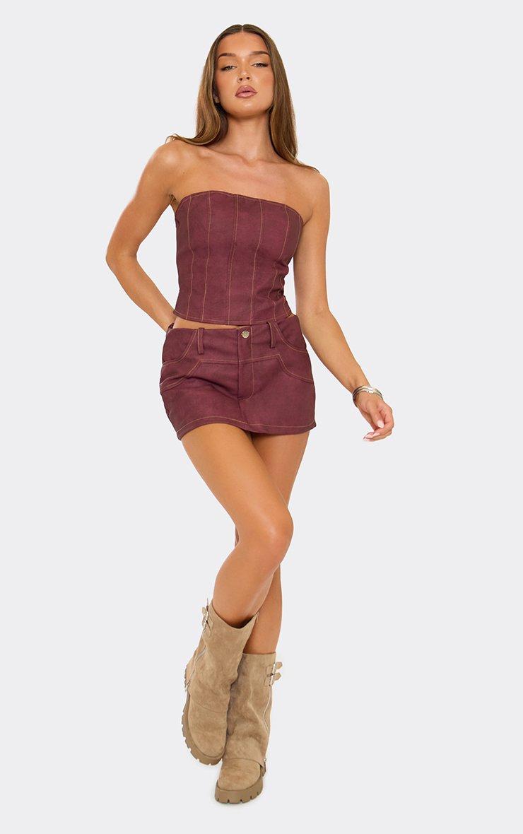 Mid Waist Contrast Stitch Skort In Burgundy Faux Leather