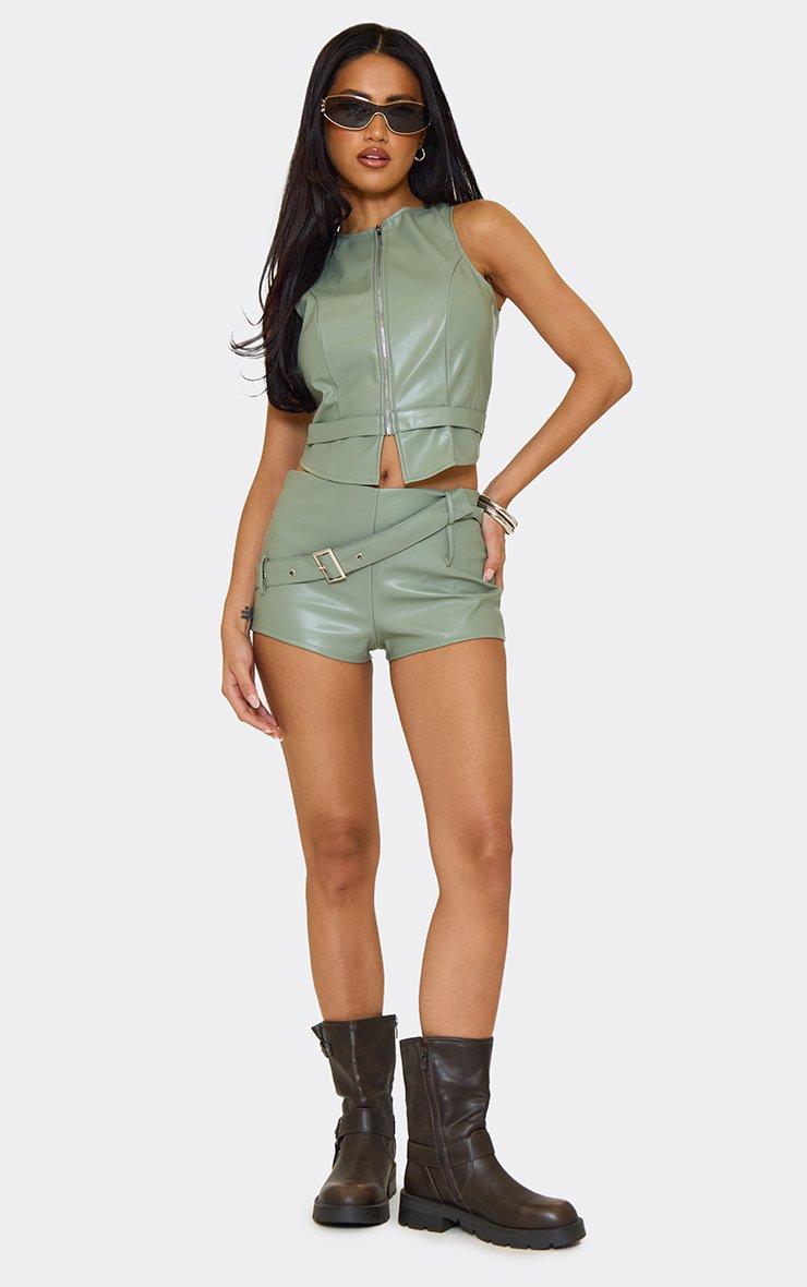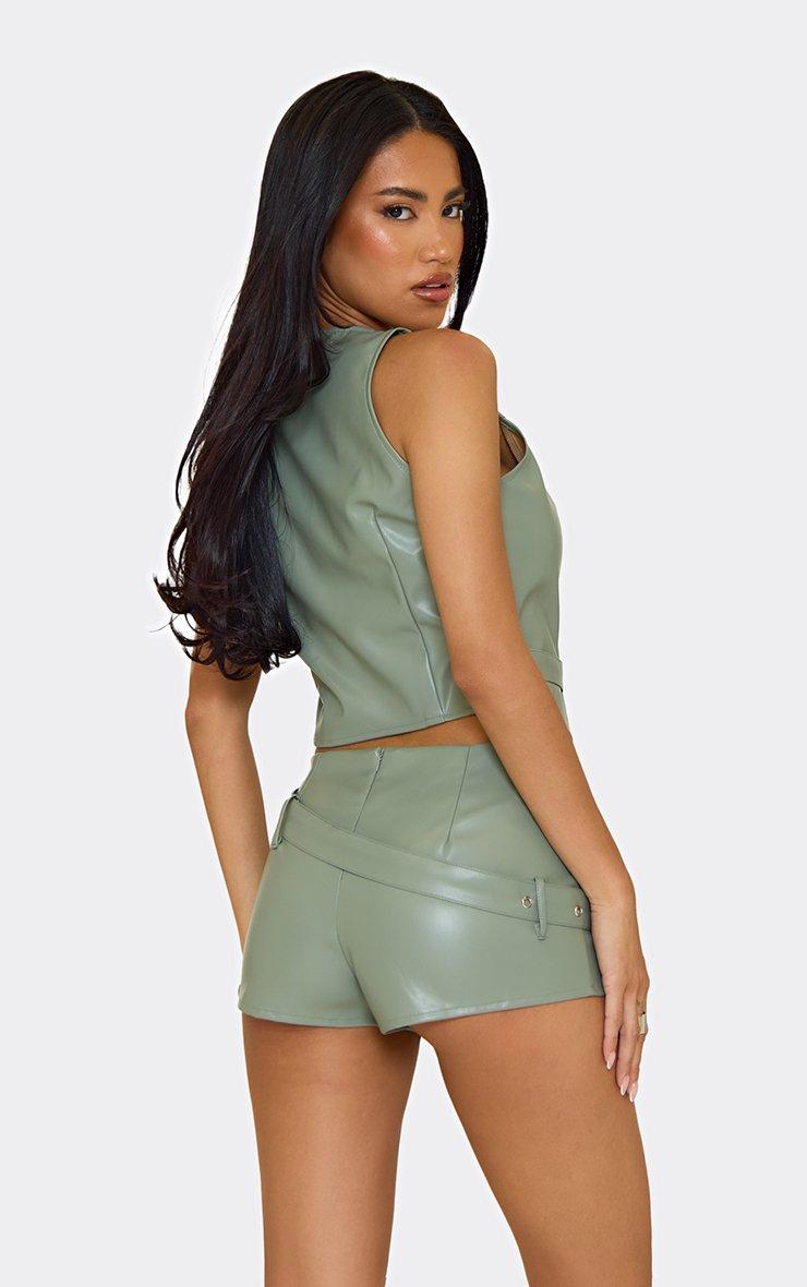 Mid Rise Belt Detail Shorts In Sage Green Faux Leather
