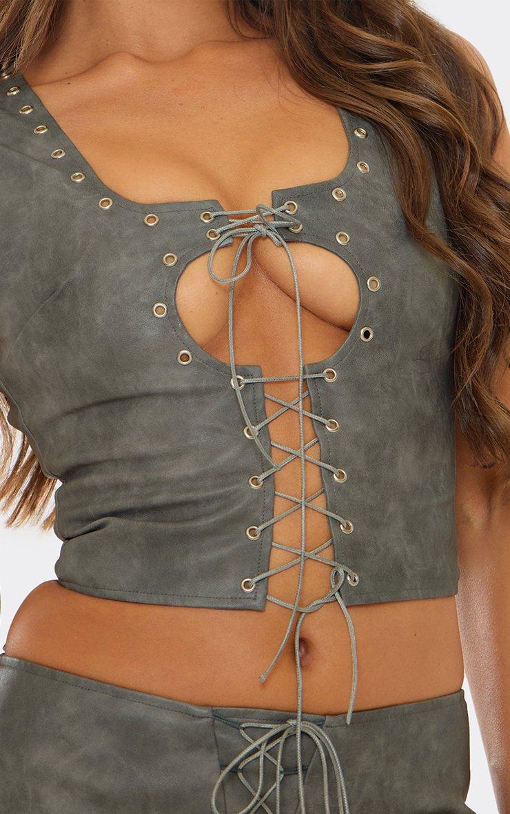 Square Neck Eyelet Lace Up Detail Top In Grey Faux Leather