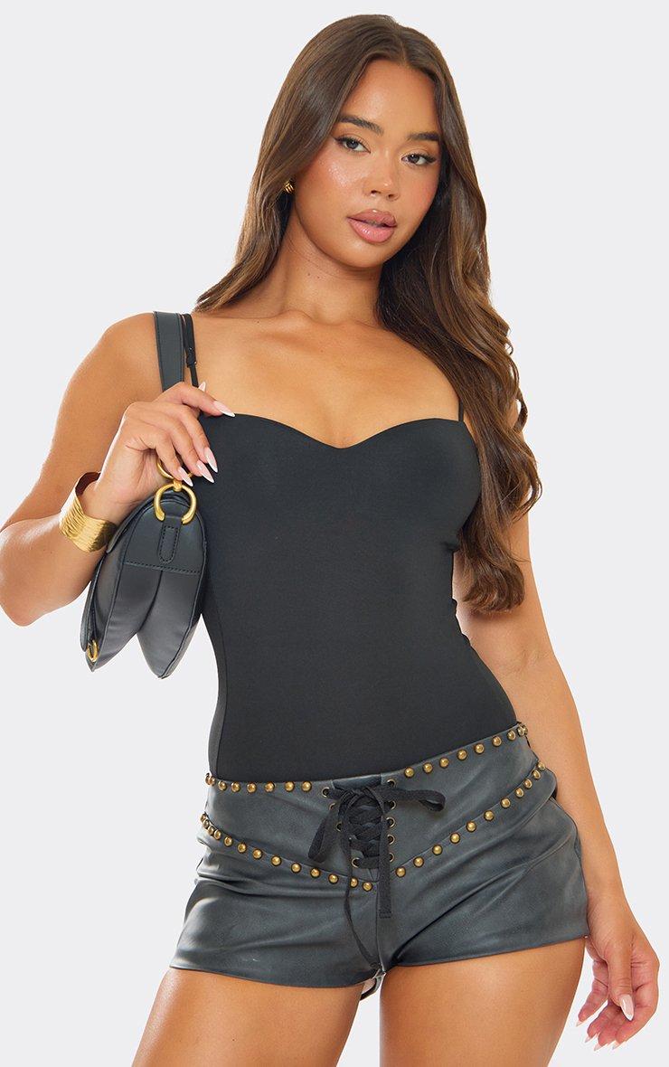 Low Rise Gold Studded Lace Up Detail Shorts In Grey Faux Leather