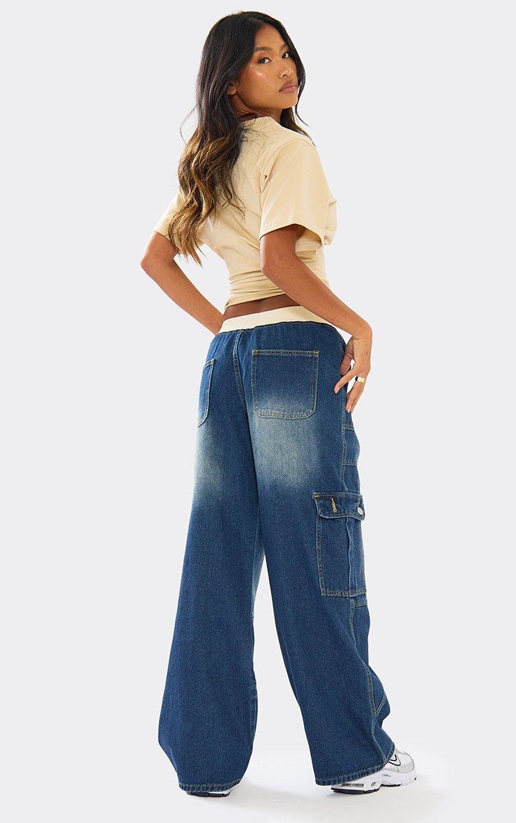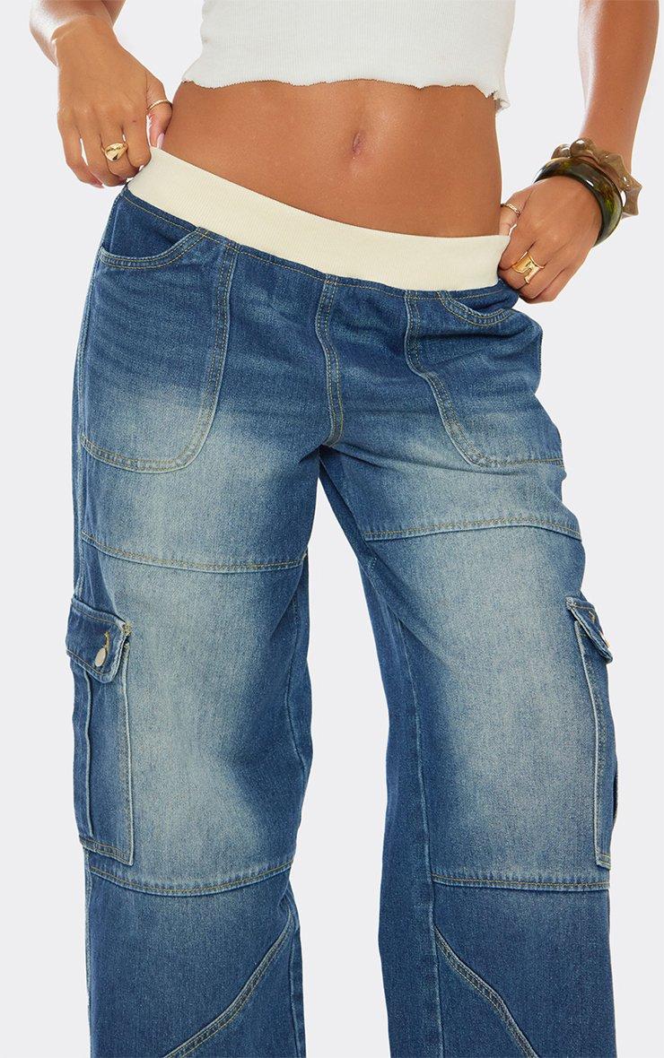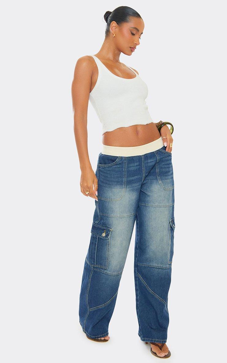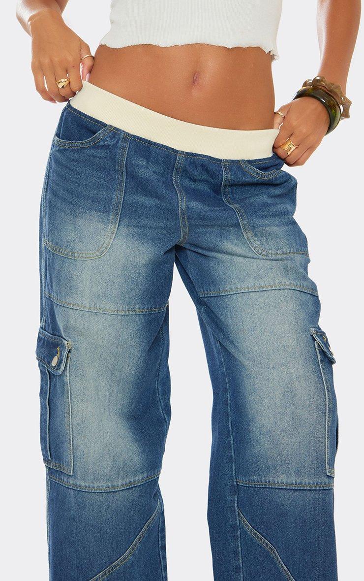 Waistband Pocket Cargo Detail Wide Leg Jeans In Mid Blue Wash Denim