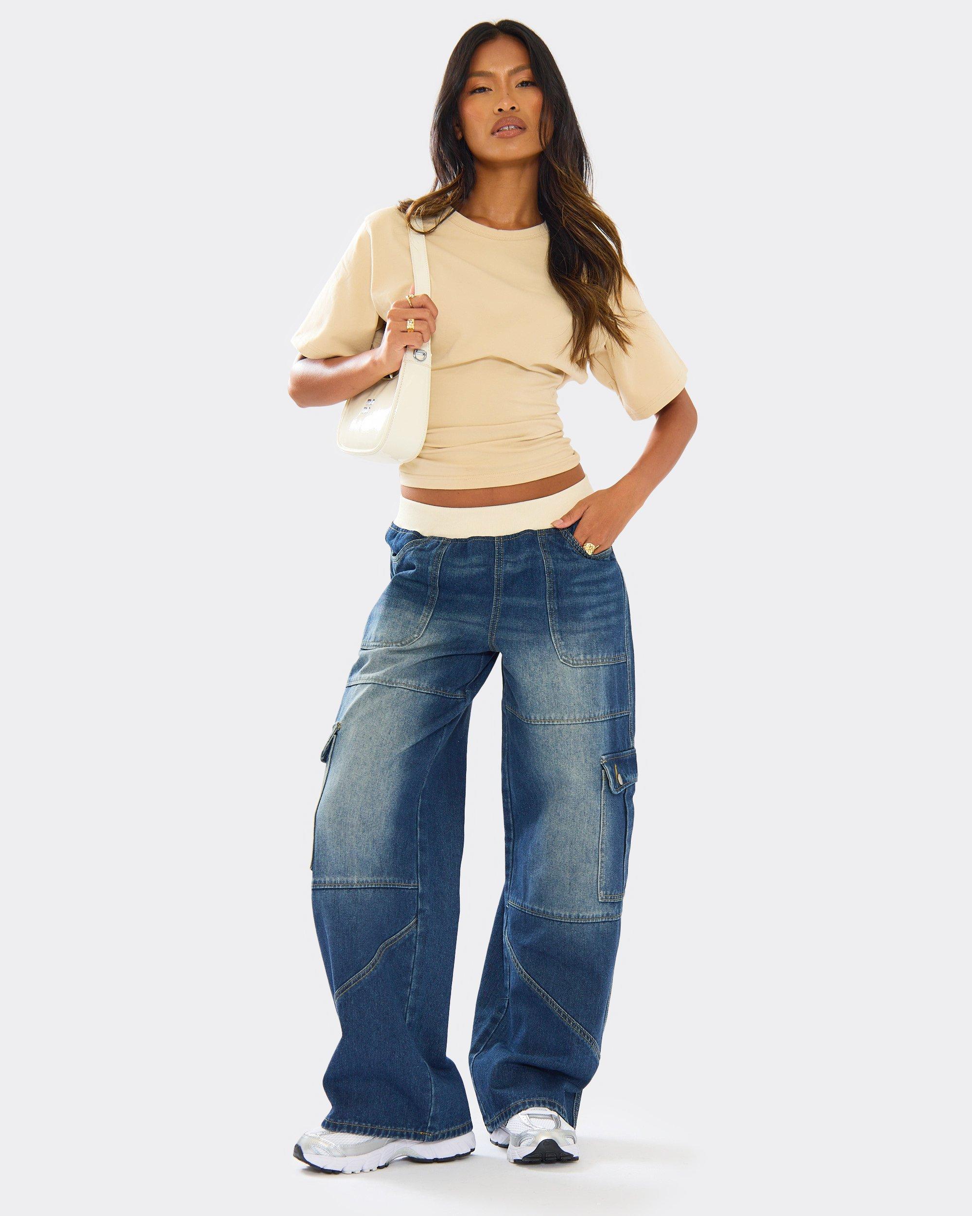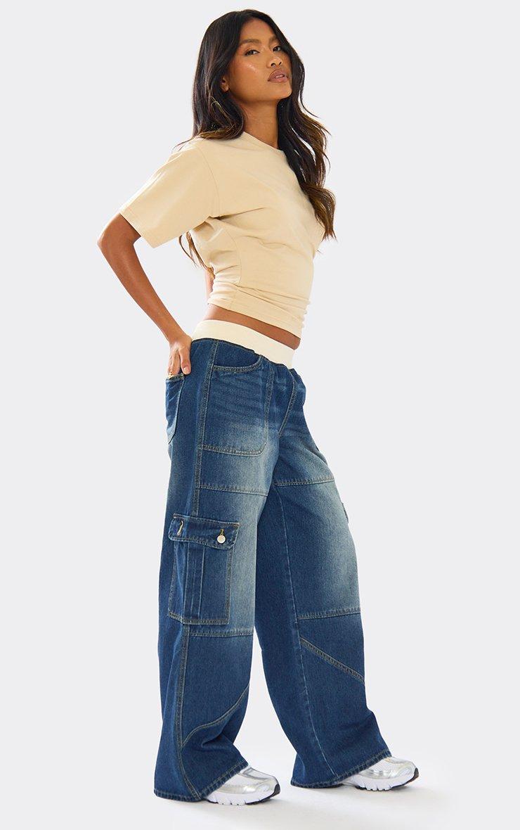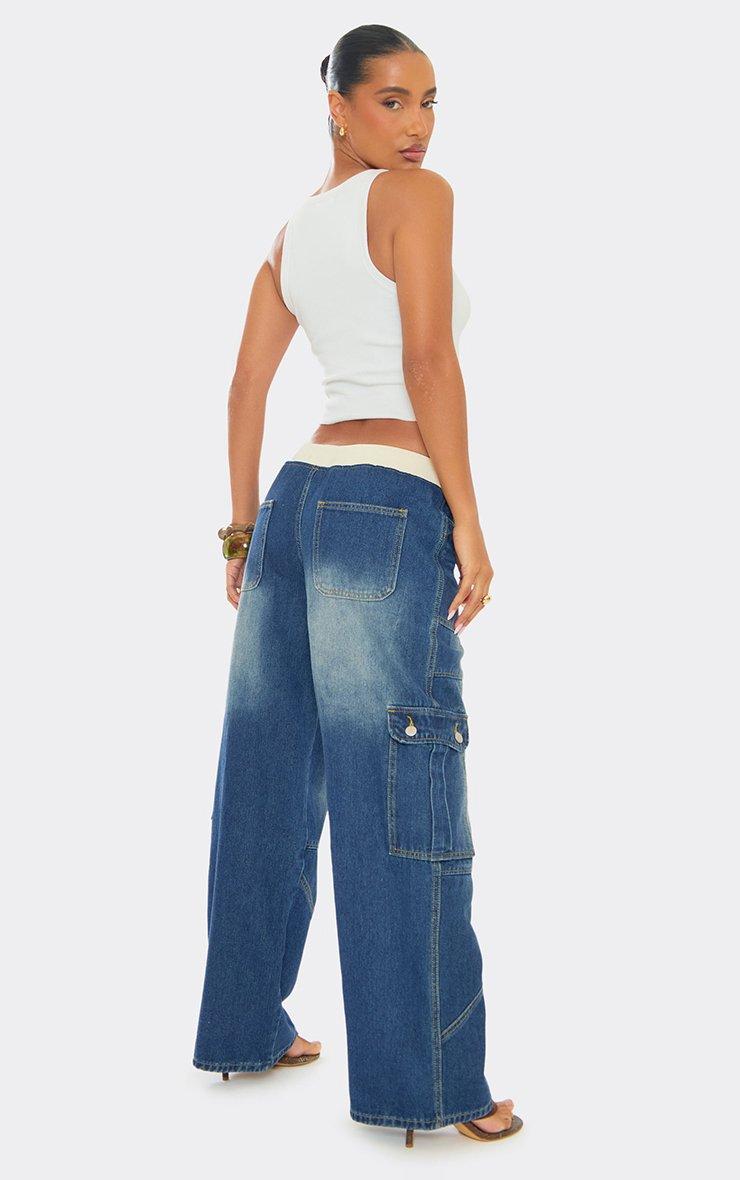 Waistband Pocket Cargo Detail Wide Leg Jeans In Mid Blue Wash Denim