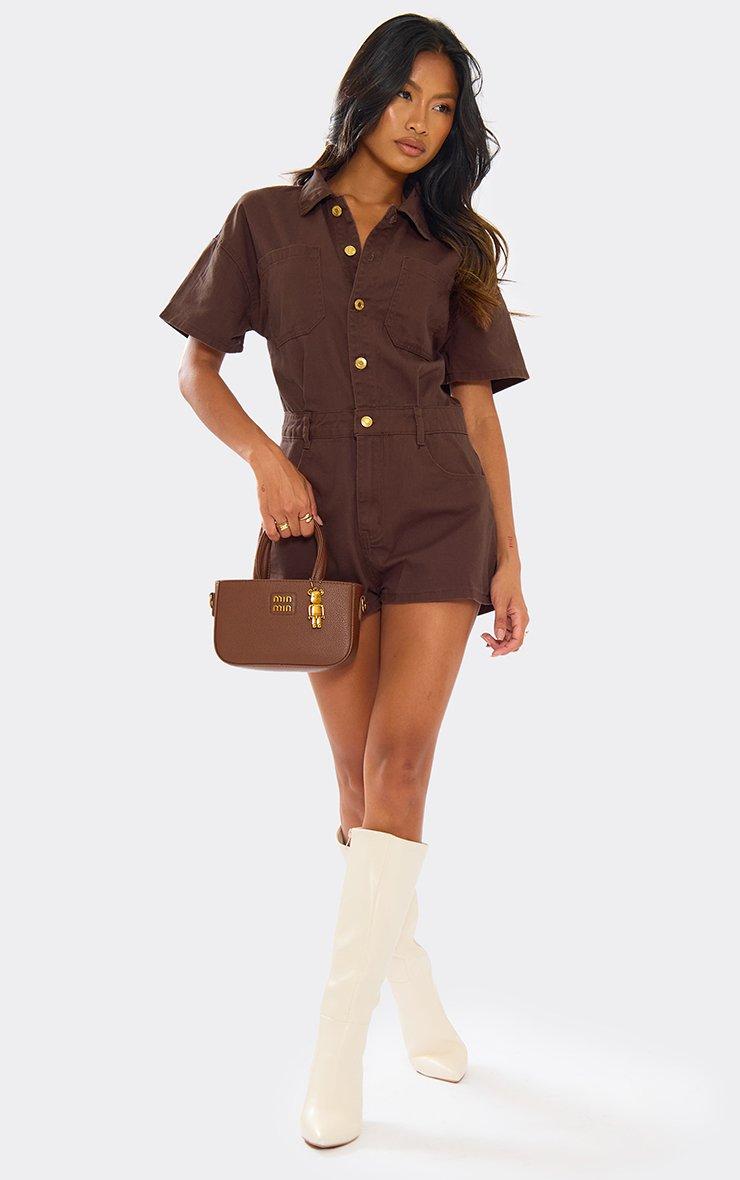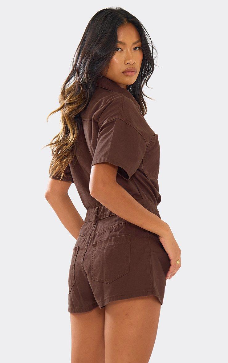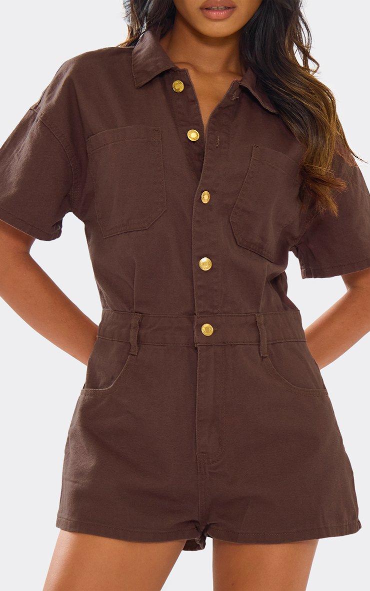 Short Sleeve Collared Button Down Playsuit In Brown Denim