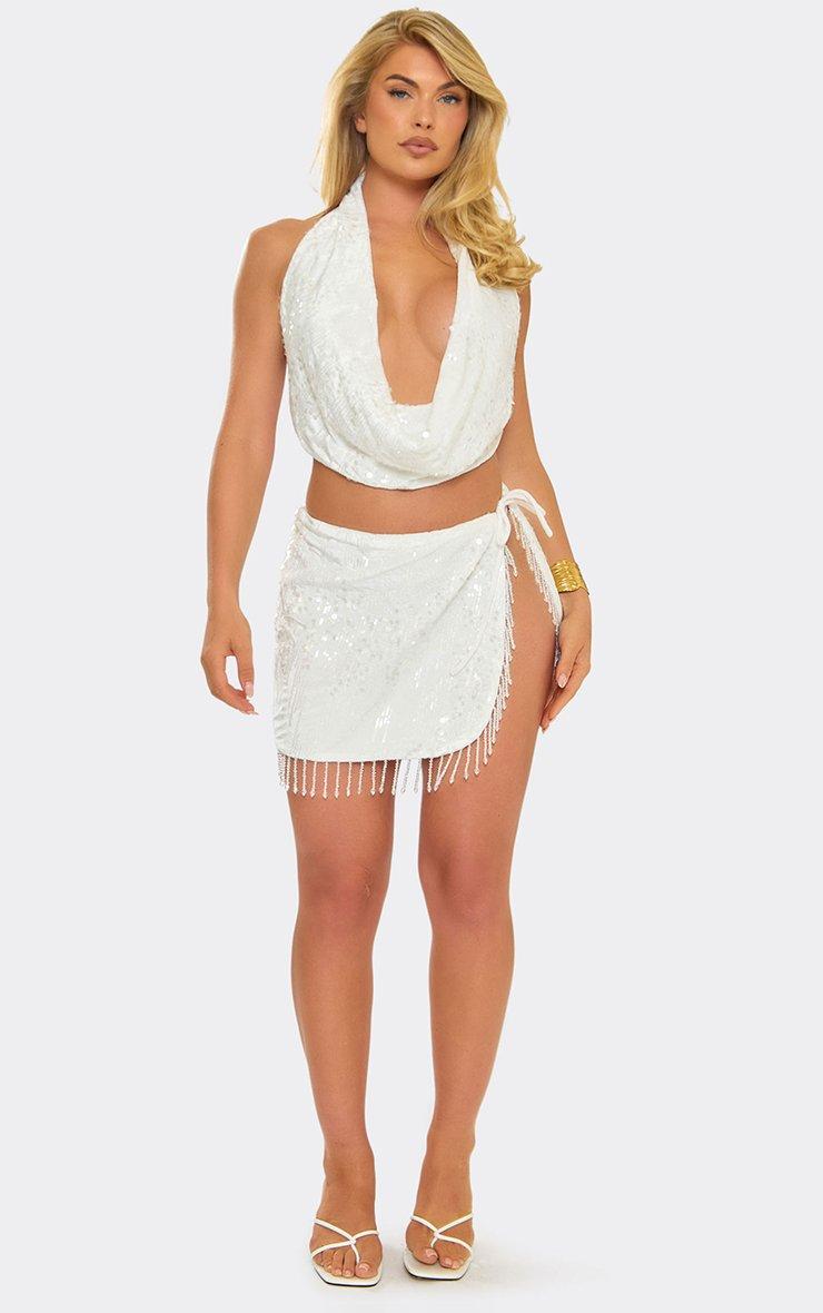 Cowl Neck Top And Tassel Mini Skirt Co-Ord Set In White Sequin