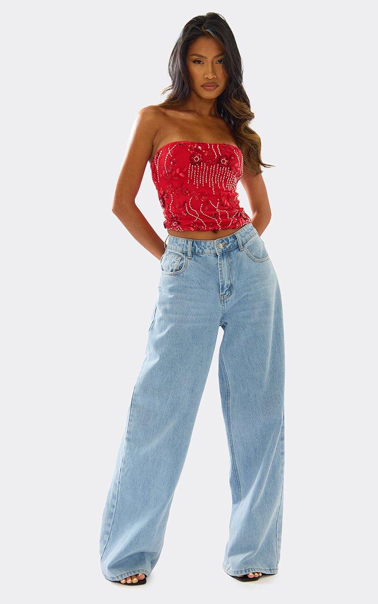 Bandeau Floral Embellished Detail Top In Red Sequin