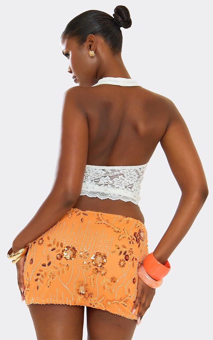 Mid Rise Floral Embellished Micro Skirt In Orange Sequin