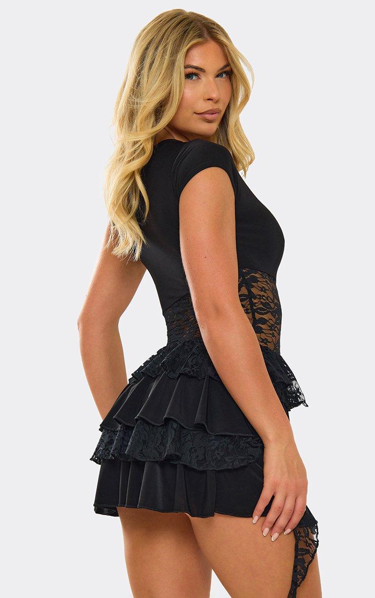 Short Sleeve Lace Frill Layered Drape Detail Mini Dress In Black