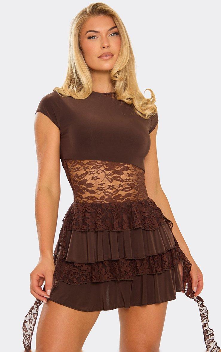 Short Sleeve Lace Frill Layered Drape Detail Mini Dress In Chocolate Brown