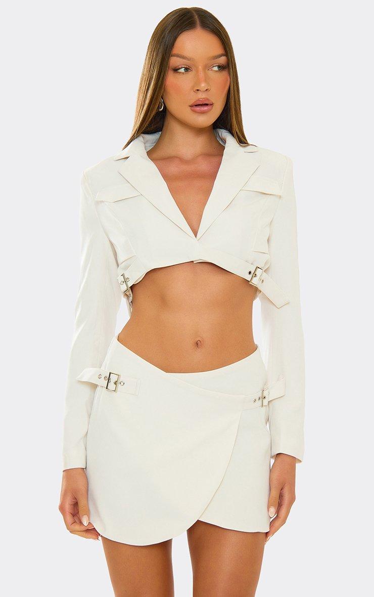 Scarf Detail Cinched Waist Asymmetric Blazer In Cream