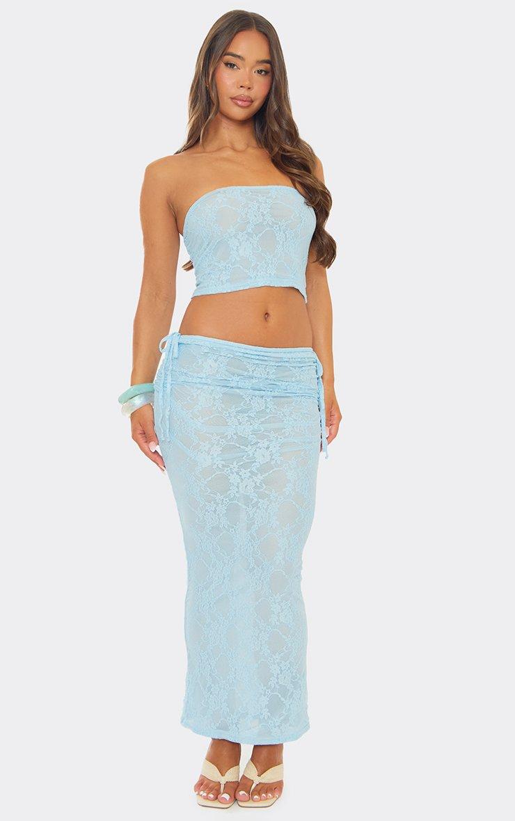 Long Sleeve Lace Up Front Frill Detail Crop Top In Blue Lace
