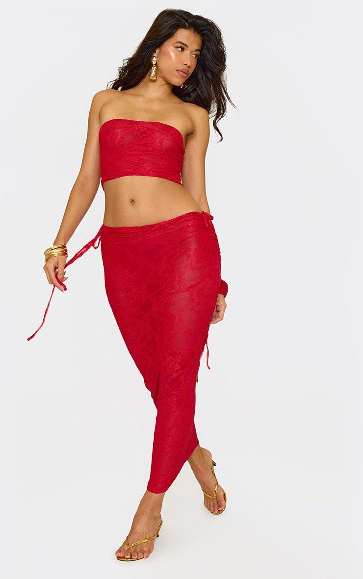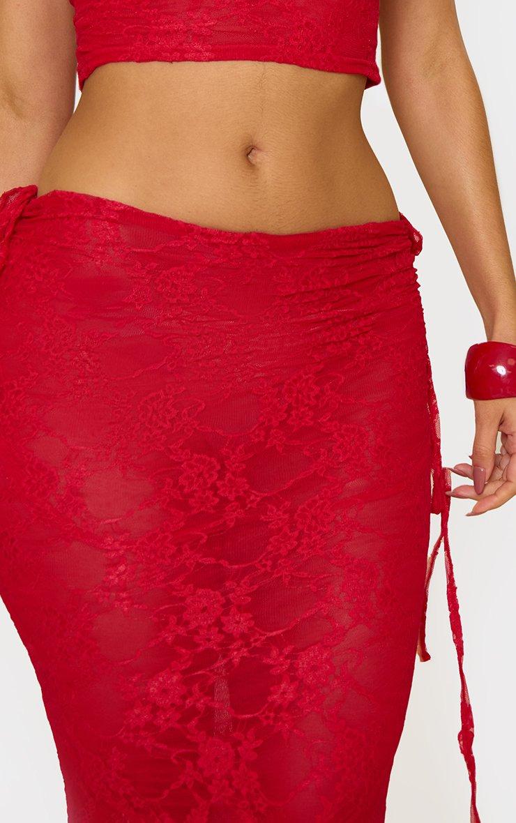 Low Rise Ruched Side Detail Maxi Skirt In Red Lace