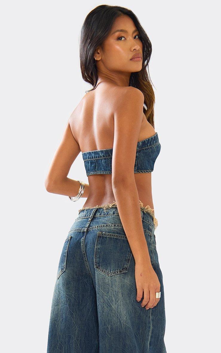 Bandeau Button Front Bralet In Washed Dark Blue Denim