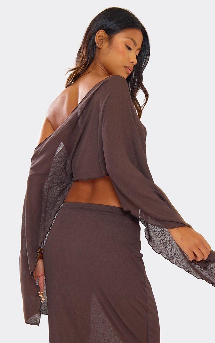 Asymmetric Lettuce Hem Detail Cape Top In Brown
