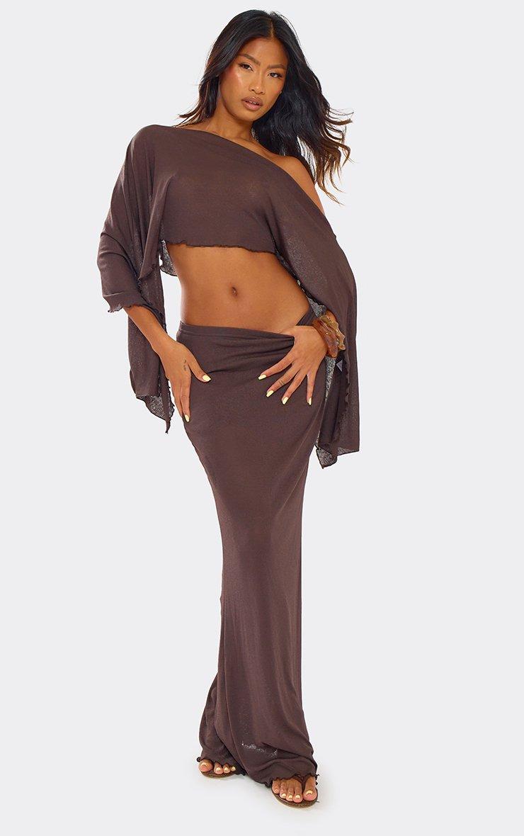 off the shoulder asymmetric lettuce hem detail cape top in brown