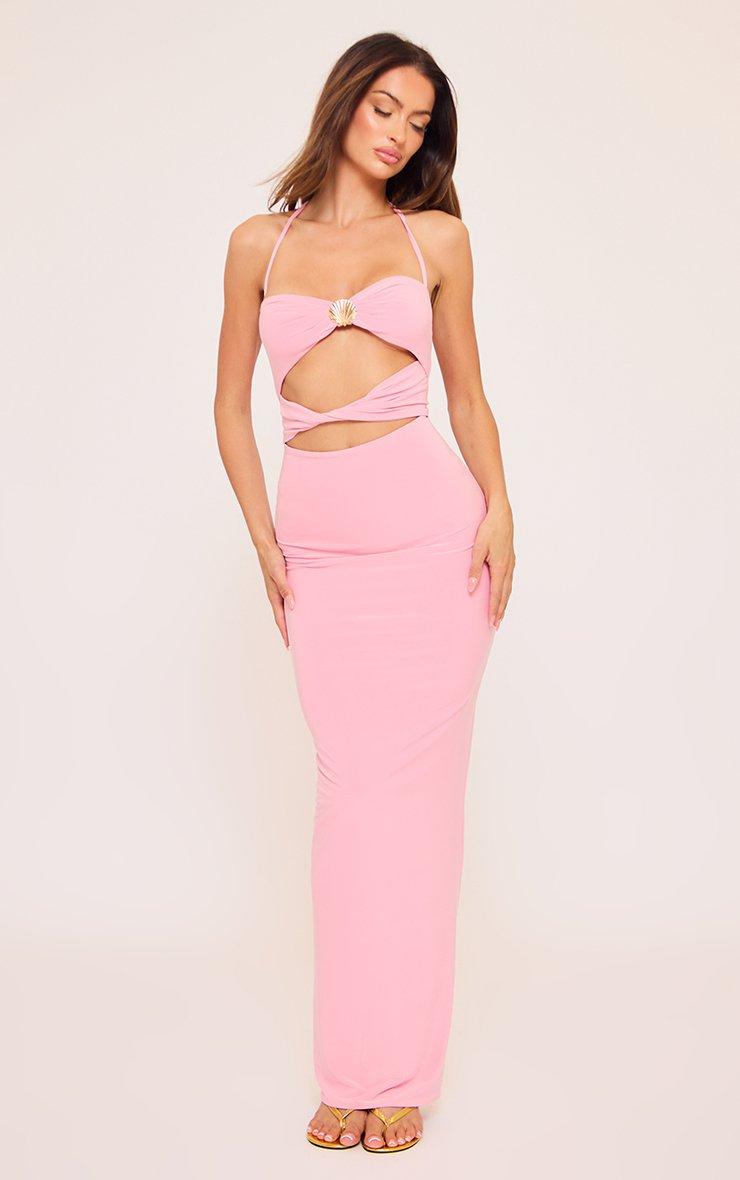 halterneck cut out twist front shell trim detail maxi dress in pink
