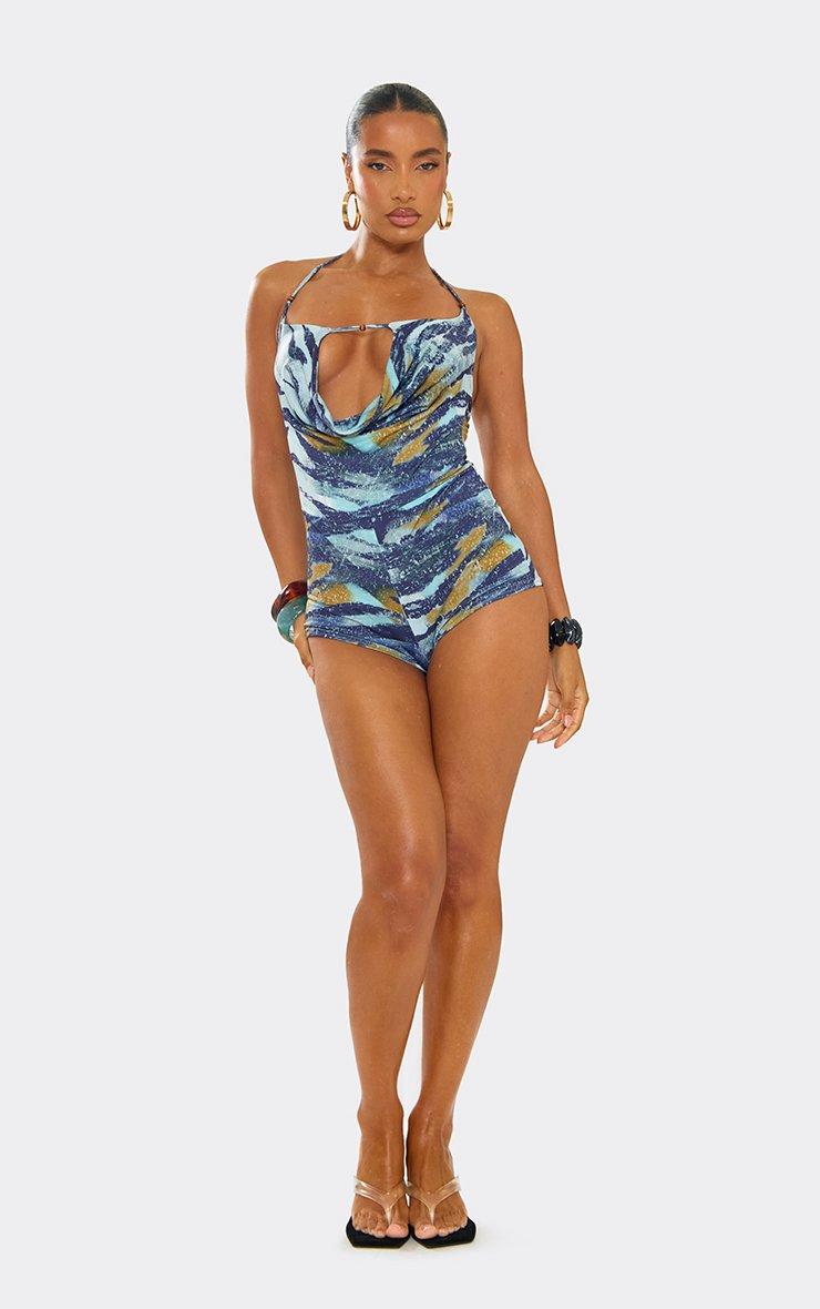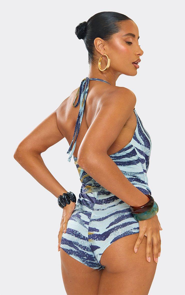 Halterneck Cowl Front Detail Playsuit In Blue Zebra Print