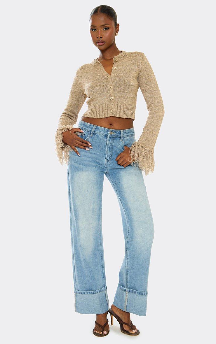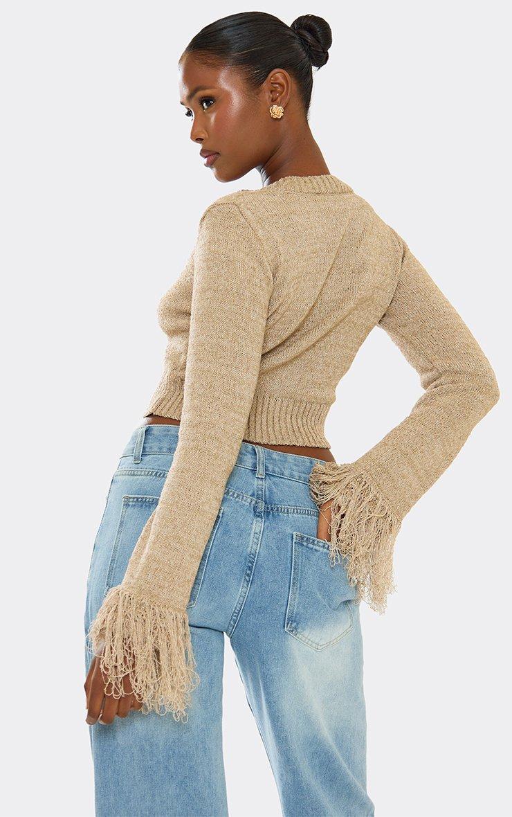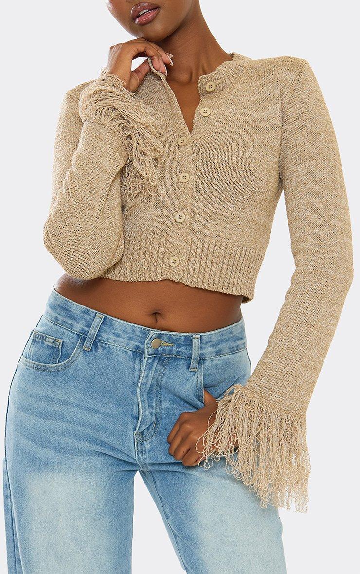 Long Sleeve Tassel Cuff Button Down Cardigan In Stone