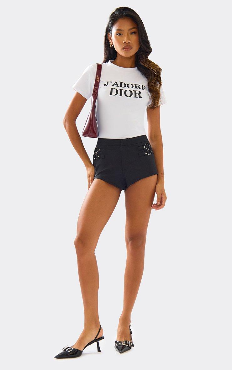 Mid Rise Buckle Detail Micro Shorts In Black Woven
