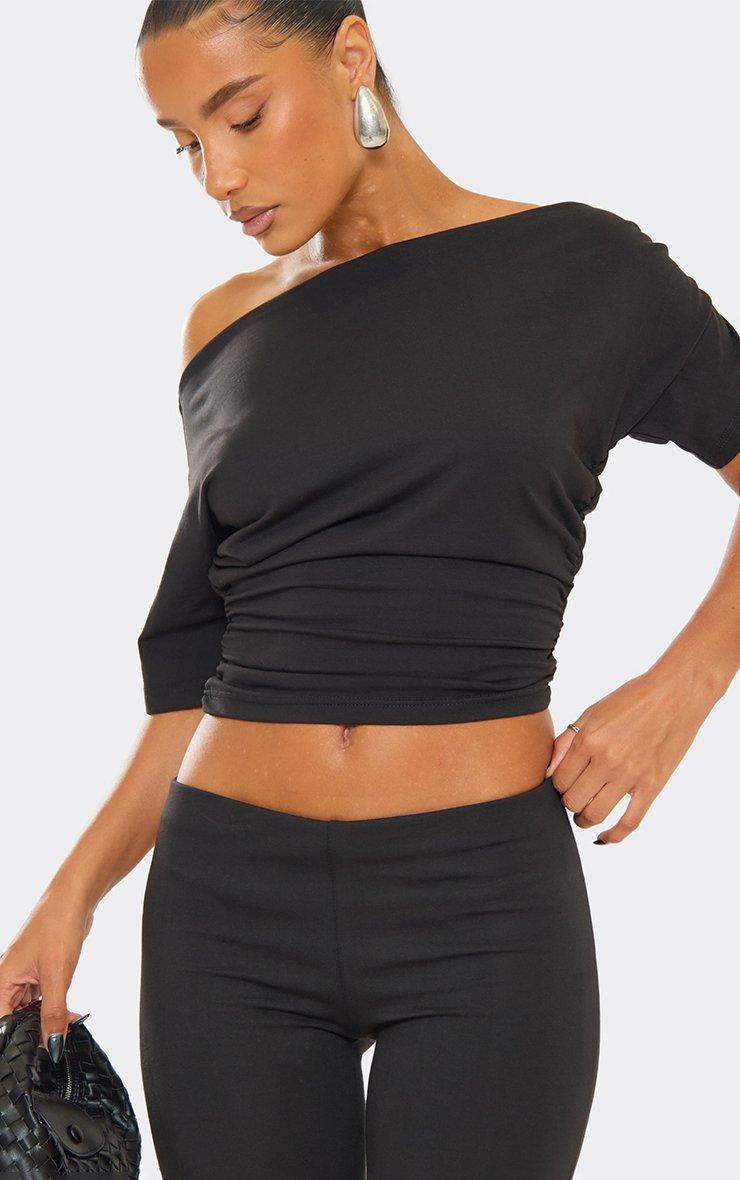High Neck Ruched Cape Detail Fitted Top In Black Slinky