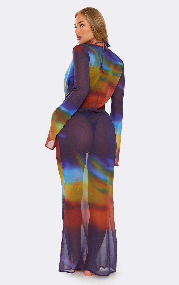 Cowl Neck Long Sleeve Maxi Beach Dress In Blue Ombre Print
