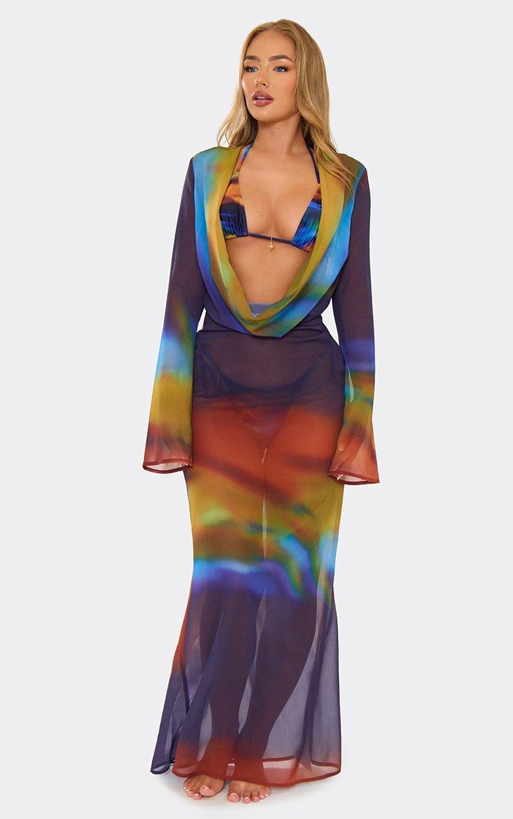 cowl neck long sleeve maxi beach dress in blue ombre print