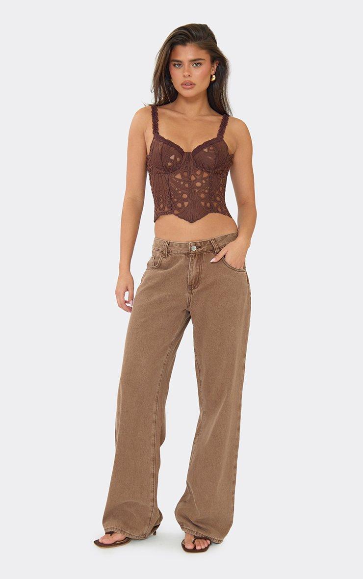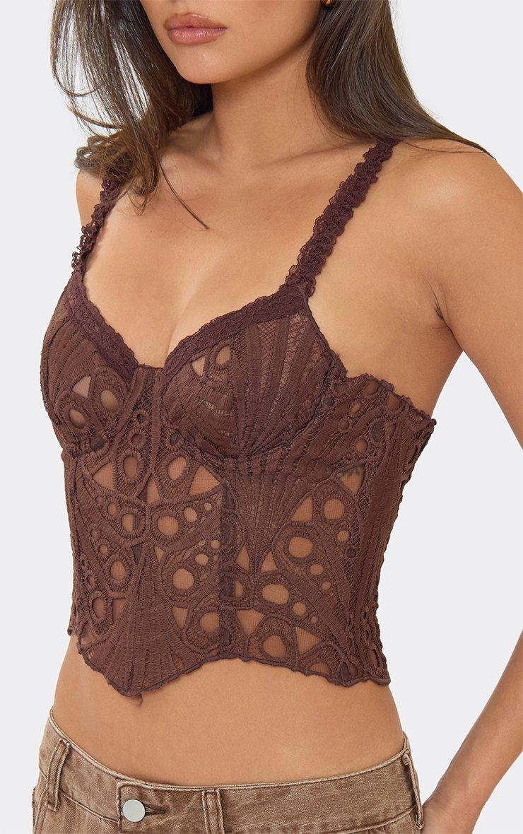 Sweetheart Neckline Corset Lace Up Back Detail Top In Chocolate Brown Lace