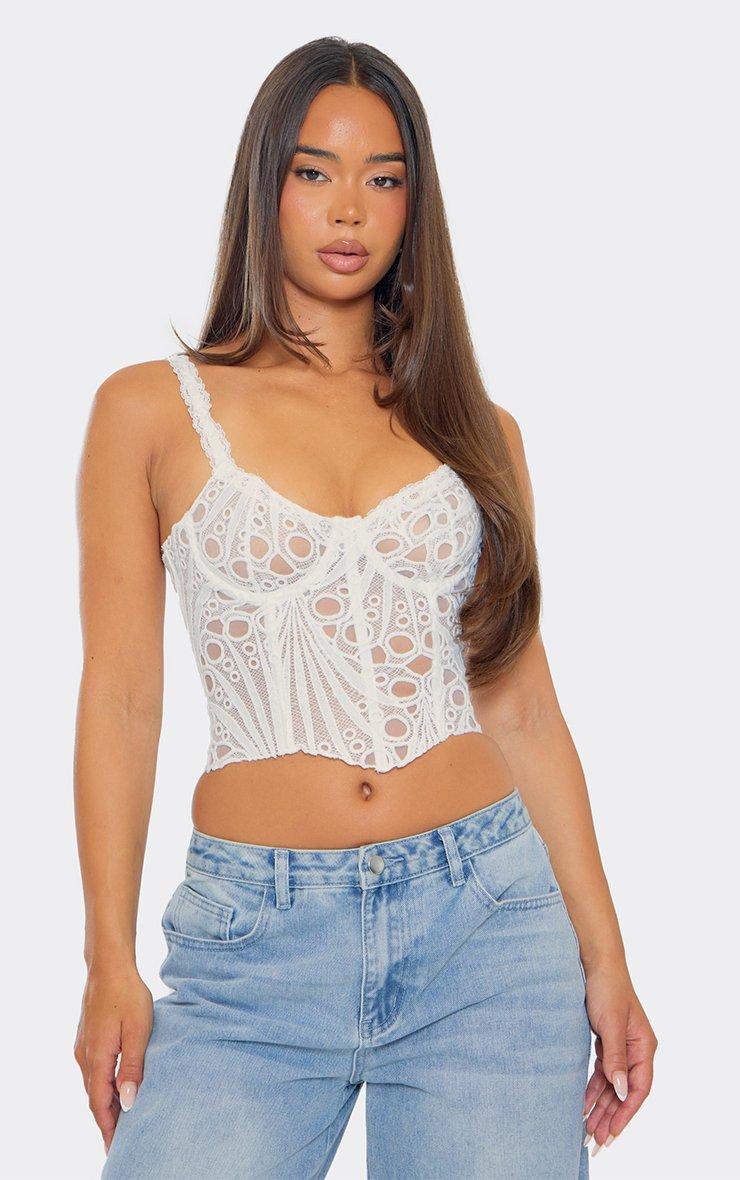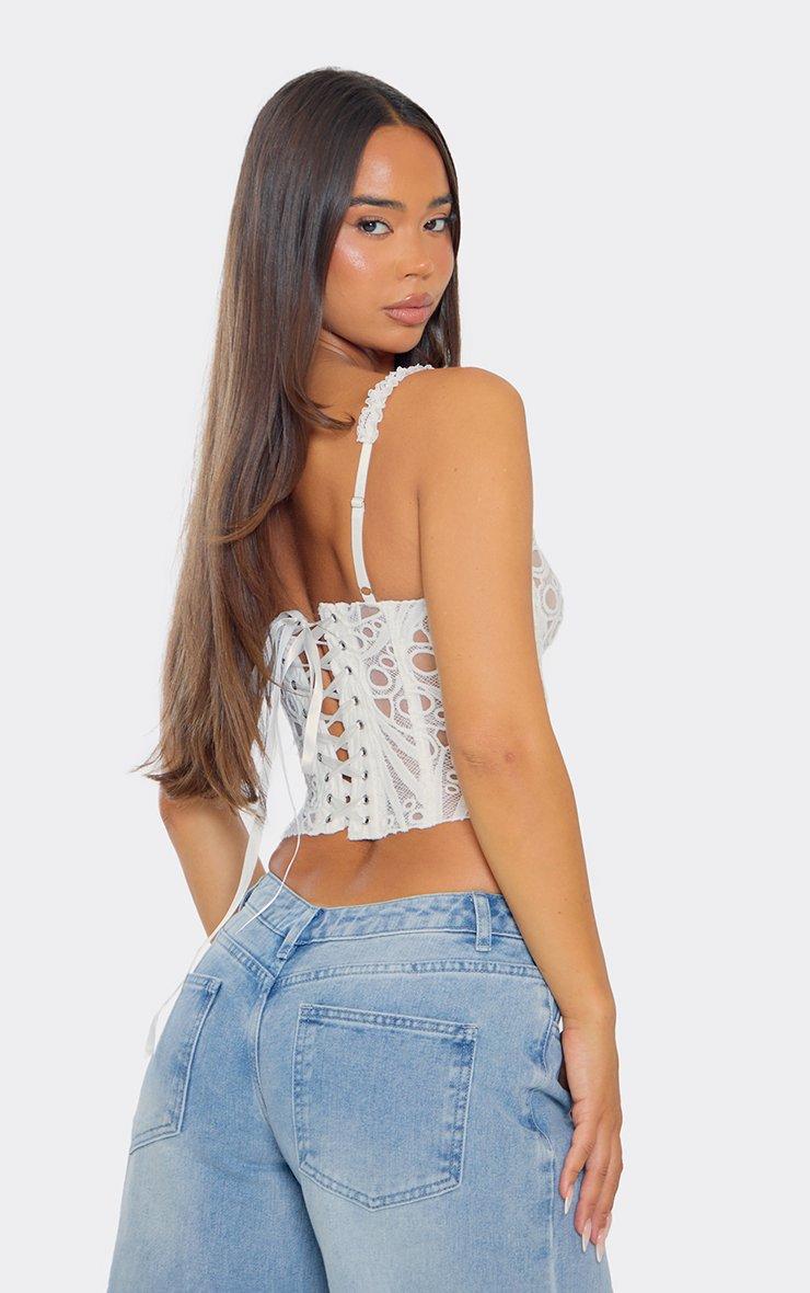 Strappy Stretch Zip Back Detail Corset Top In White Lace