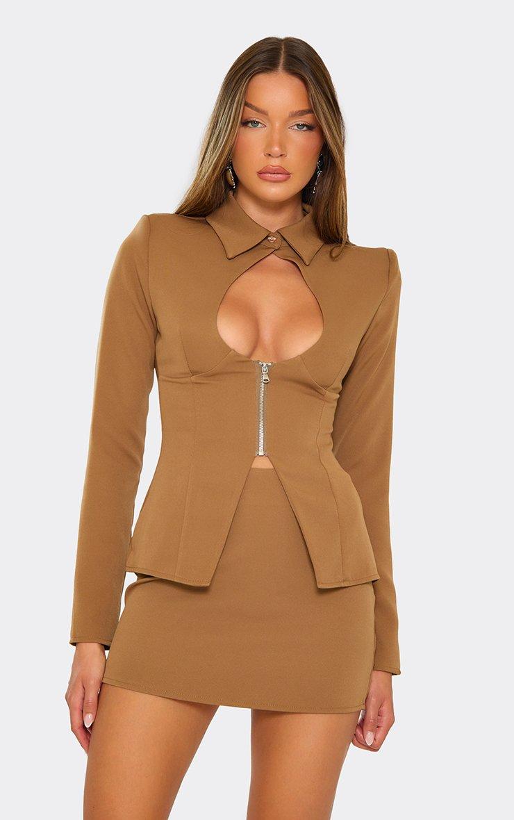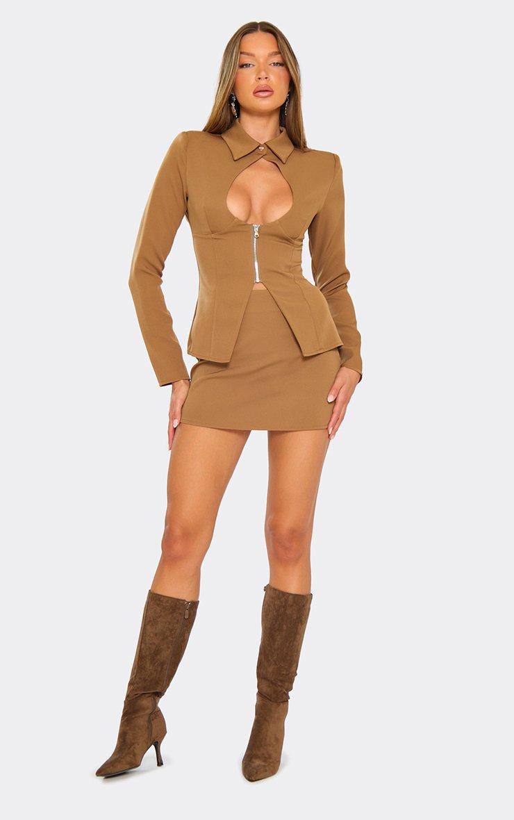Mid Waist Tailored Mini Skirt In Camel Brown