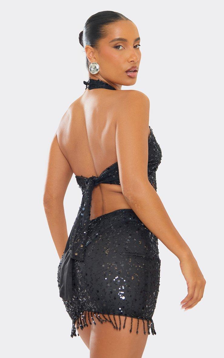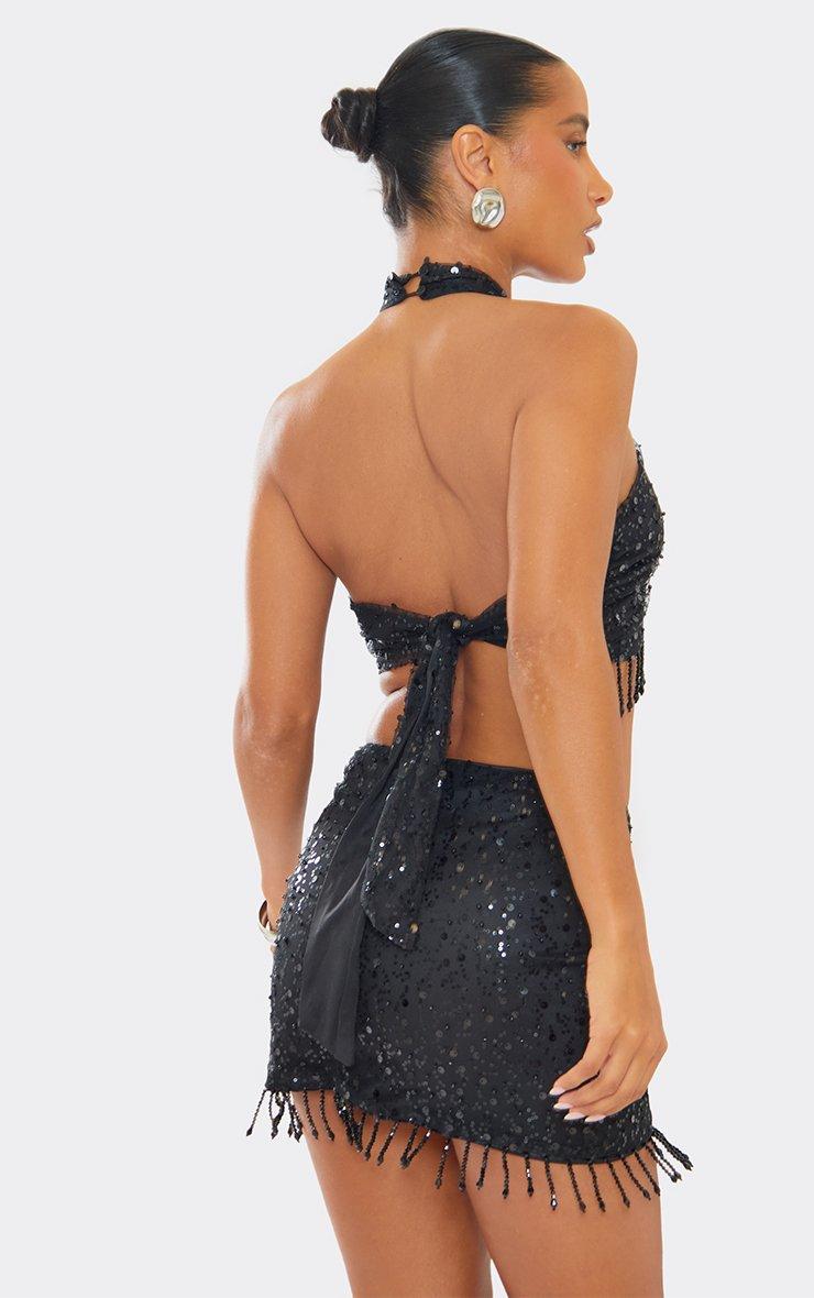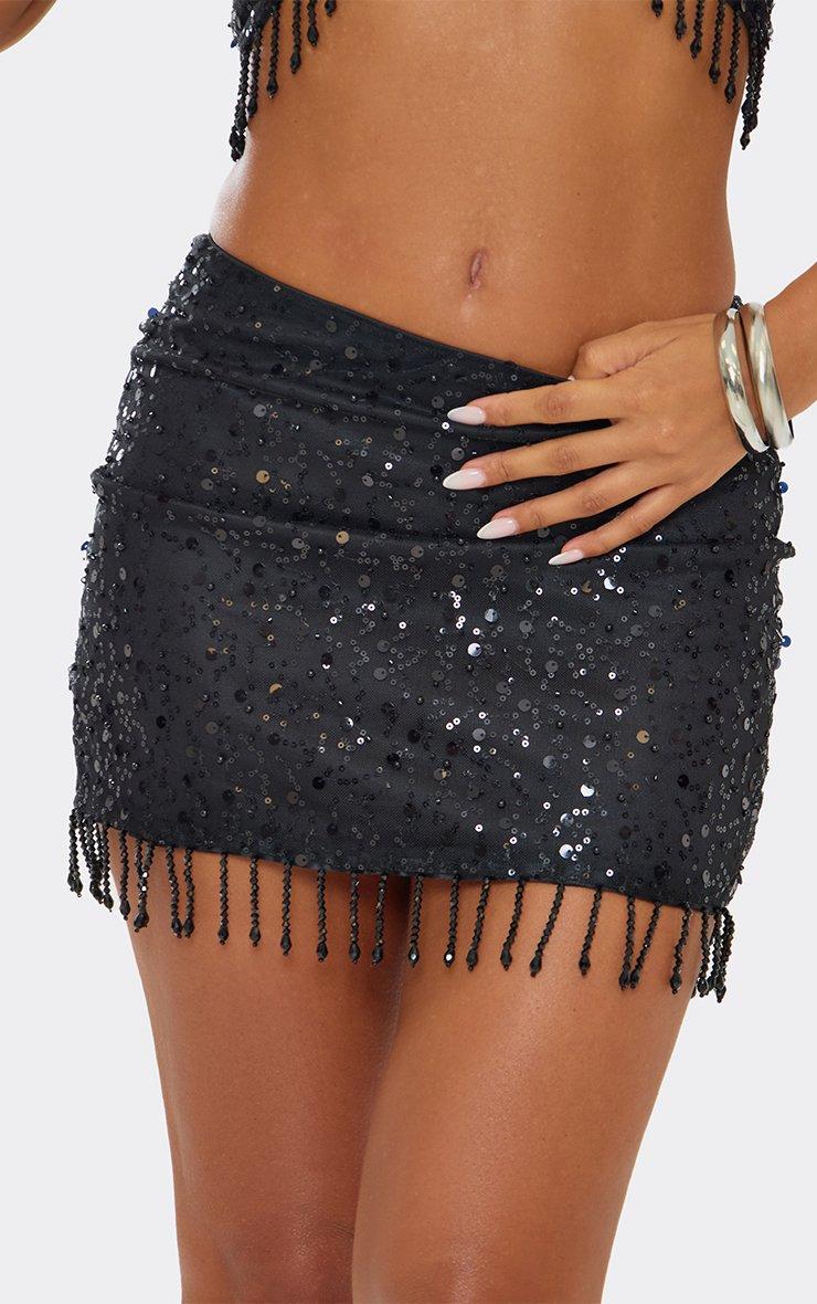 Mid Waist Beaded Tassel Trim Mini Skirt In Black Sequin
