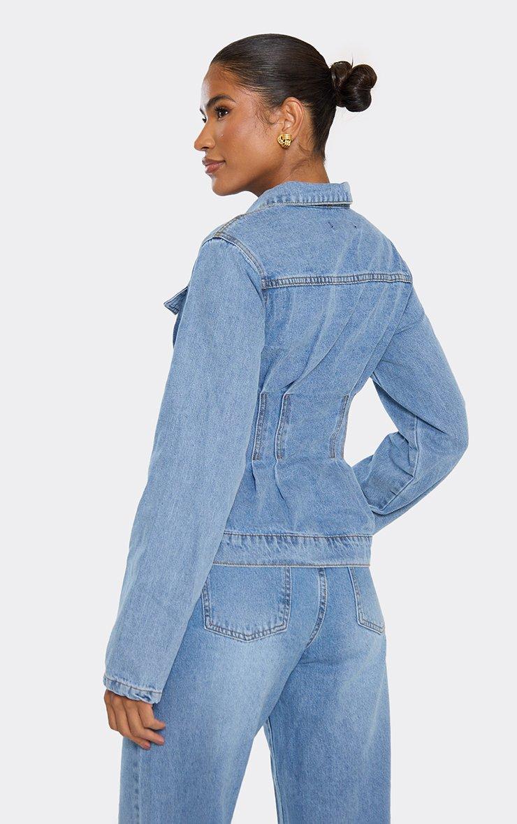 Long Sleeve Cinched Waist Seam Detail Jacket In Mid Blue Denim